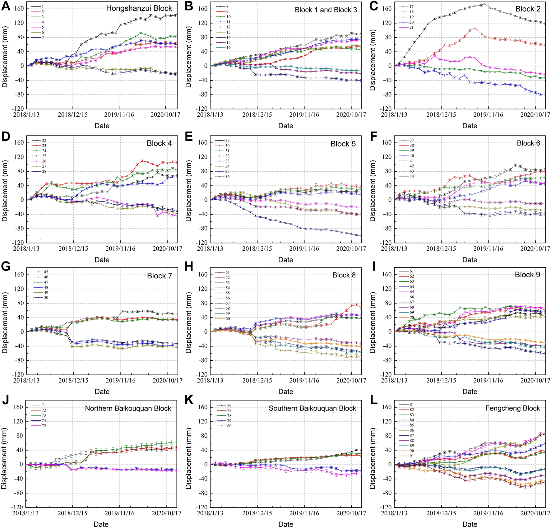 Time series deformation curves of the 91 deformation points in different blocks from January 2018 to December 2020. The positions of the 91 deformation points are shown in Figure 3. Each deformation curve is plotted with error bars, representing the mean standard deviation of average deformation rate.