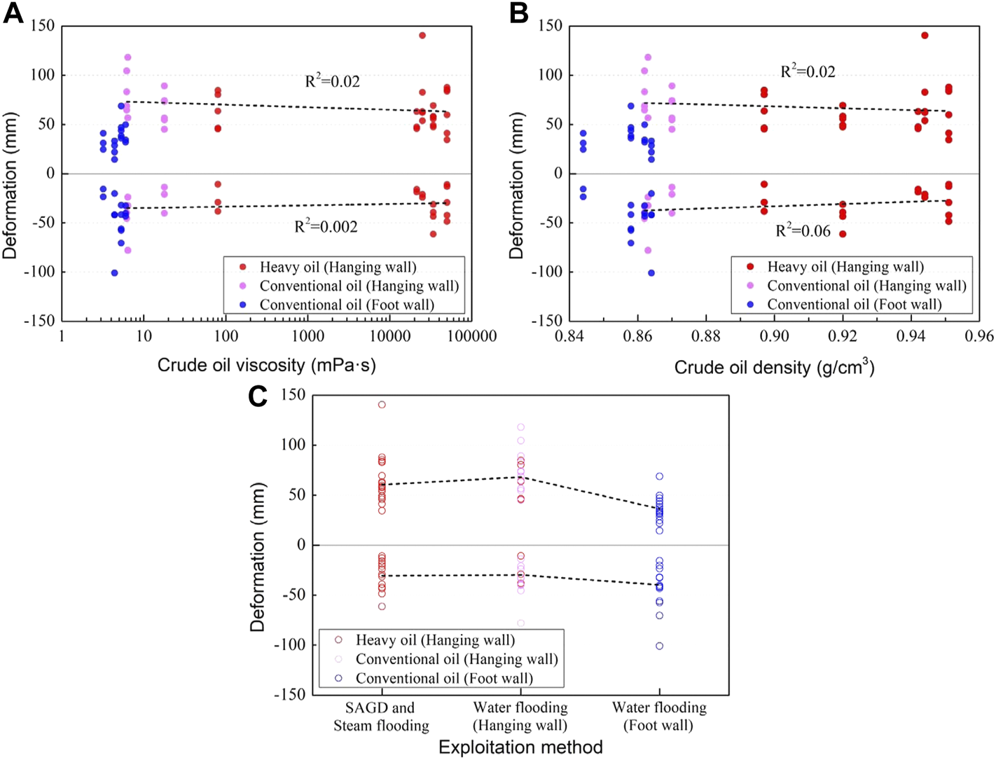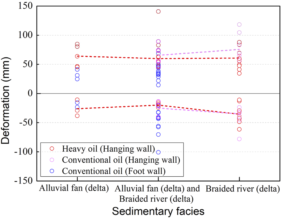 As shown in Table 2, since the lithology in different blocks is basically the same due to multiple production layers, the influence of lithology on surface deformation is negligible. In order to study the influence of sedimentary facies on surface deformation, we divide the blocks into three categories, the blocks with alluvial fan facies or fan delta facies, the blocks with braided river facies or braided river delta facies, and the blocks with both of the two kinds of facies mentioned above. The relationship between the sedimentary facies and surface deformation is shown in Figure 5. The influence of different sedimentary facies on the surface deformation can be identified, when other factors are basically the same. The points with same color have similar crude oil properties and reservoir buried depth. Since most of the points in conventional oil blocks in the footwall (blue points) are developed both alluvial fan and braided river deposits, the influence of different sedimentary facies on the surface deformation can be only identified by the red points and pink points. The average surface deformation of the points with same color in different sedimentary facies was calculated and connected with dotted lines. As shown in Figure 5, except for a few points, the main surface deformation range of the same color points and the average values in different sedimentary facies are similar, indicating that sedimentary facies have little impact on surface deformation.