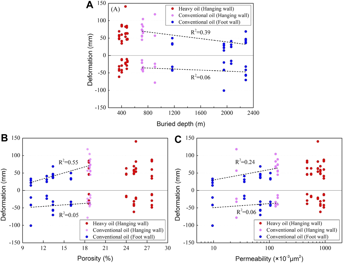 The influence of one factor group can be separated if the other factor groups are basically the same. According to the crude oil properties and the buried depth of the reservoirs, we divided the 91 deformation points into three categories: the points of the heavy oil blocks in the hanging wall, the points of conventional oil blocks in the hanging wall, and the points of conventional oil blocks in the footwall, which are shown in different colors for further analysis (Figure 5). The points with same color have similar crude oil properties and the reservoir buried depth. The red points and pink points are similar in buried depth, but different in crude oil properties. The pink points and blue points are similar in crude oil properties, but different in buried depth.