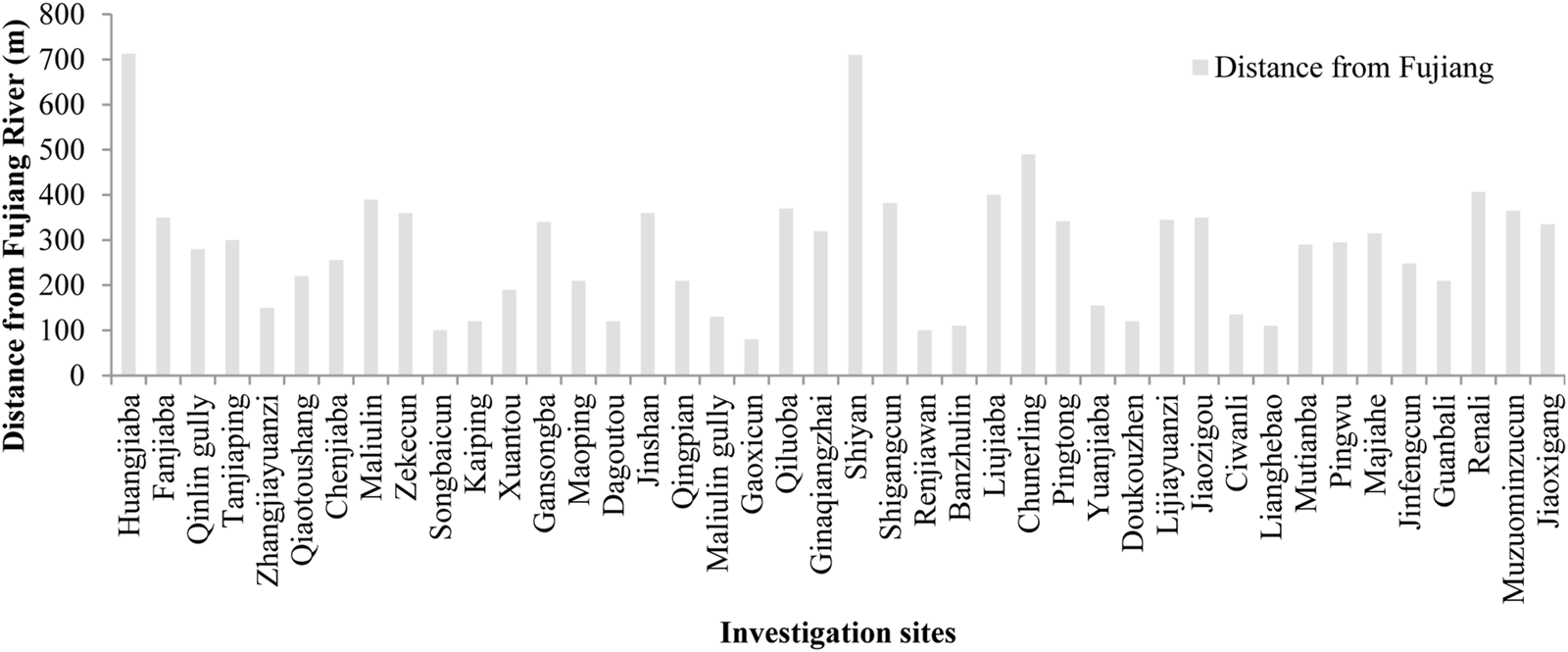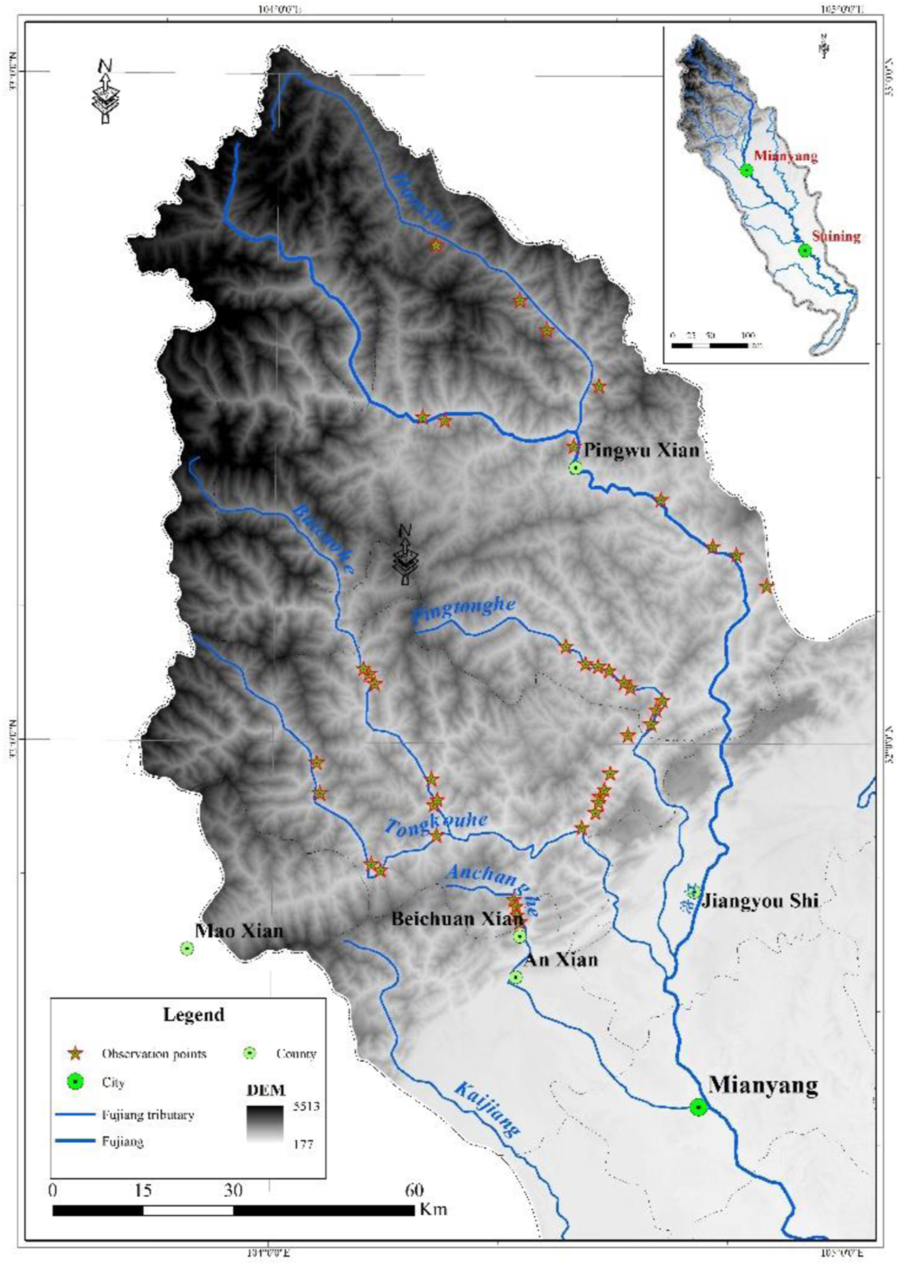 The study area of the Fujiang River is almost 36,400Â km2 in size. Its main river length is 670Â km and it originates from Xuebaoding Mountain, Pingwu County, Sichuan Province. The Fujiang River flows across Pingwu, Jiangyou, Mianyang, Santai, Shehong, Suining, Tongguan, and lastly merges with the Jialing River in the Hechuan district, Chongqing. Among its characteristics, the geomorphology of the upstream Fujiang River is a typical alpine valley region, and the Longmen Fault traverses across the entire watershed from Beichuan County to Nanba town. On both sides of the fault, the mountain surface is crushed and the landform undulates dramatically based on the complex geological structure and frequent geotectonic movement. Debris flow, landslides, and rock falls are the main potential geological hazards in this region. While the geomorphology of the downstream areas of the Fujiang River consists of small plains and hills, which appear to be within a relatively stable regional geological environment, only a few minor landslips and water source pollution episodes constitute the main hazard problems along the bank side. Figure 1 illustrates the watershed which helps to infer the character of the disaster area. Field investigation points are also shown.