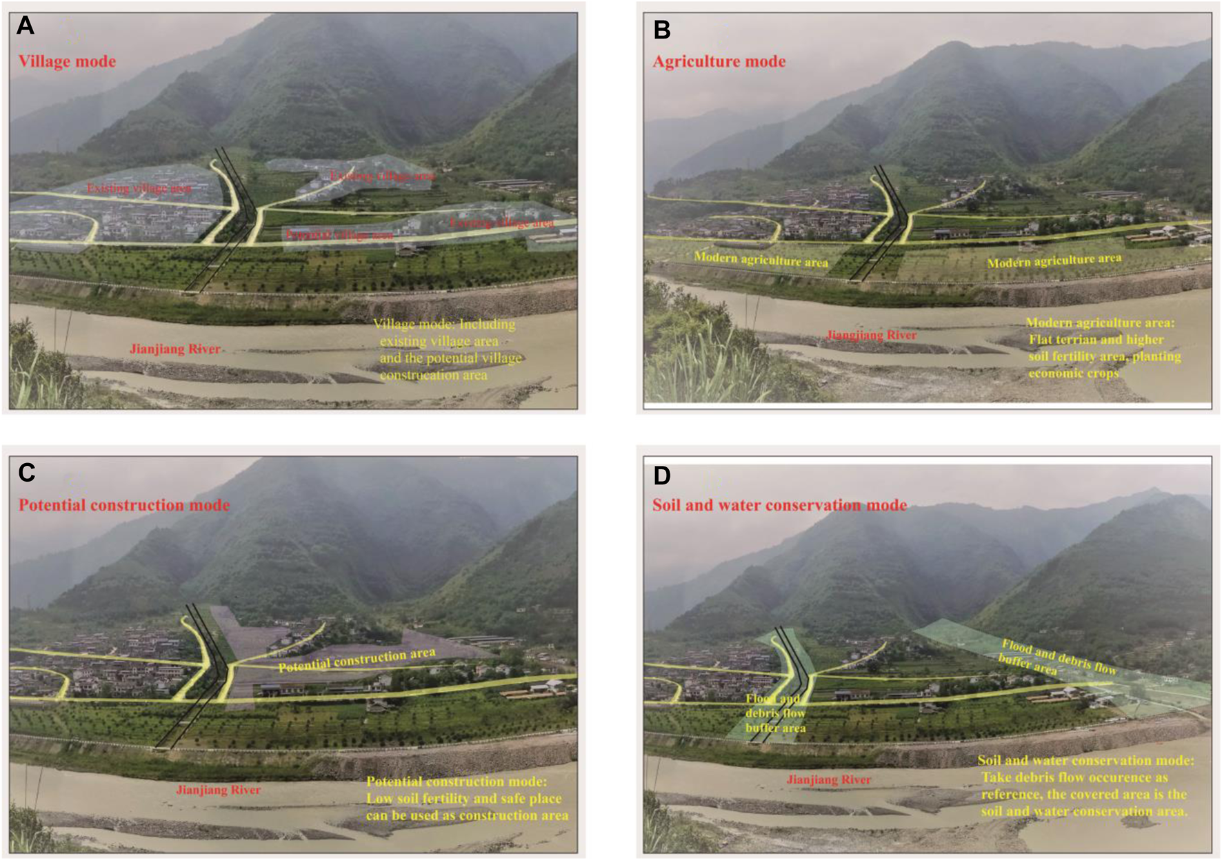 Huangjiaba debris flow disaster land-use scenario ((A) Village scenario (B) Agriculture scenario(C) Soil and water conservation scenario (D) Potential construction scenario).