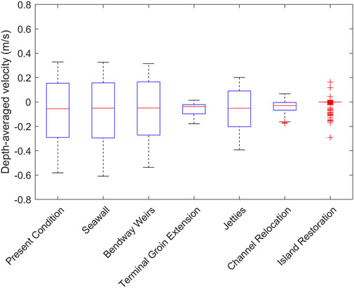 FIGURE 4. Box-and-whisker plots of depth-averaged along-channel velocity versus present condition and alternatives at the south flood channel. Negative velocities indicate ebb flows, while positive velocities indicate flood flows. The horizontal red line indicates the median velocity. The vertical length of the blue boxes indicates the 25th and 75th percentiles of velocity. The black whiskers extend to the maximum and minimum velocities, excluding outliers, which are represented with red plus symbols.
