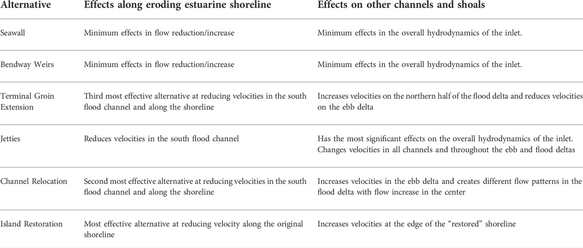 Island restoration, channel relocation, and terminal groin extension alternatives were the most effective at reducing velocity magnitudes and increasing the time below the erosion threshold in the south flood channel (Table 4). However, the wider impact of these coastal protection interventions on circulation across the delta and inlet must also be considered, owing to the potential for morphological evolution and hydrodynamic patterns that could shorten project life durations. For example, despite island restoration being rated as the most effective alternative at reducing velocities along the shoreline, the increased currents along the “new shoreline” could lead to fast erosion of the restored land, thus potentially decreasing the durability of a project of this kind. Table 5 presents a summary of the effects of each alternative along the shoreline, alongside the effects on velocities in the surrounding areas.
