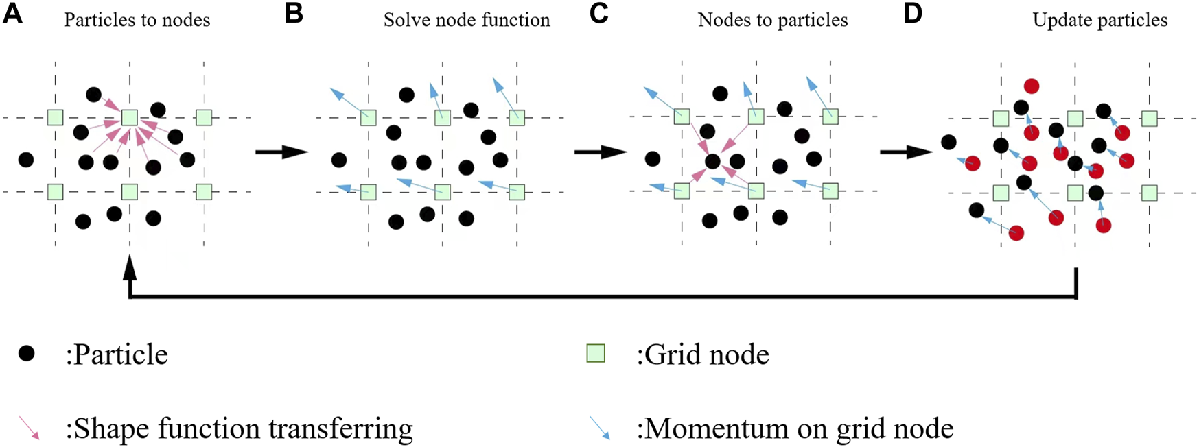 Computational cycle for the standard Material Point Method. (A) Map information from particles to grid nodes. (B) Solve node function. (C) Remap information to particles. (D) Update velocity and position of particles.