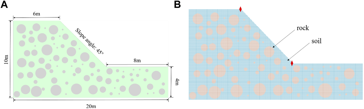 (A) Geometric parameters of SRM slope model. (The red marked points are the monitoring points of the shoulder and foot of the slope) (B) Discrete model of slope by MPs. (53636 material points in total, 38750 MPs for soil, 14886 MPs for stone).