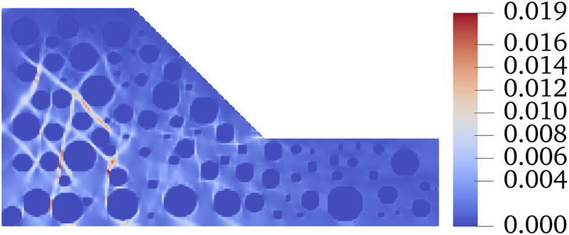 MPM simulation was carried out based on the material point model in Figure 2B and the mechanical parameters in Table 1; the distribution of shear bands is shown in Figure 3.