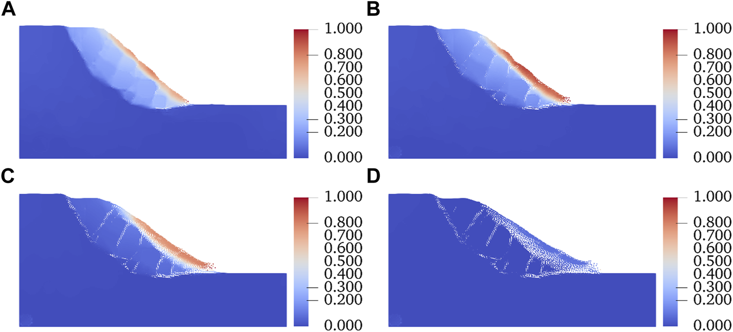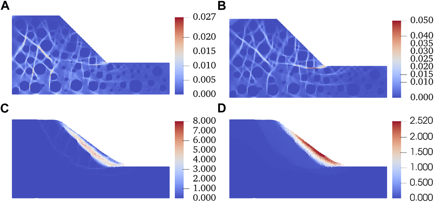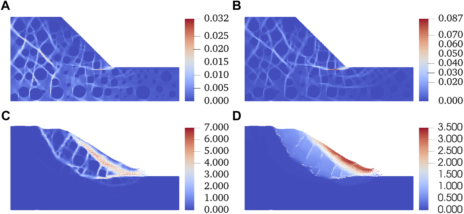Development of shear bands with decreasing . (A) Distribution of shear band at the cohesion of 20 kPa. (B) Distribution of shear band at the cohesion of 10 kPa. (C) Distribution of shear band at the cohesion of 1 kPa. (D) Distribution of displacement (m) at the cohesion of 1 kPa.