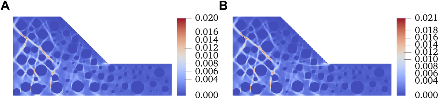 Development of shear bands with decreasing . (A) Distribution of shear band at the angle of 20°. (B) Distribution of shear band at the cohesion of 16°.