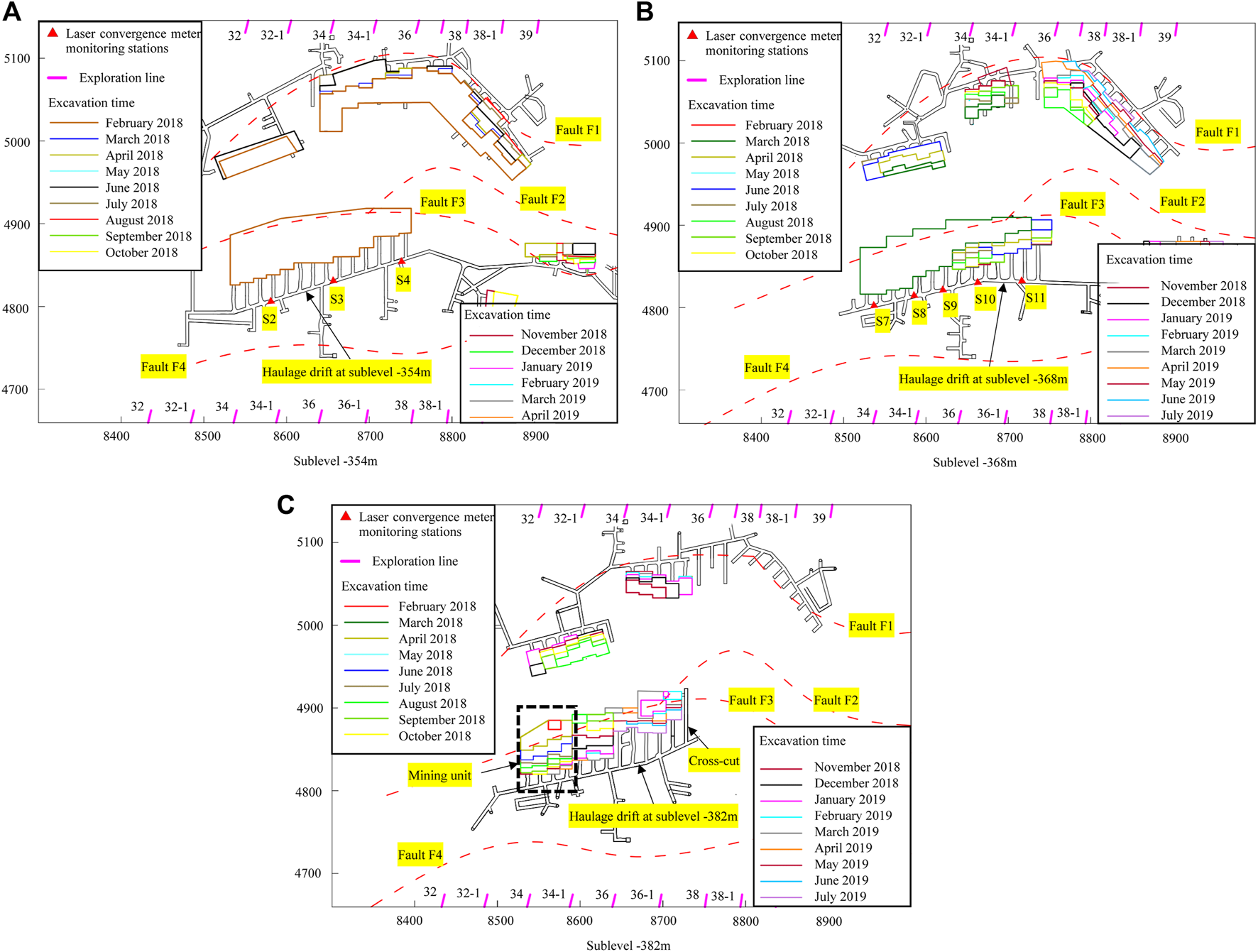Planar projection of the laser convergence meter monitoring stations and the mined-out areas. (A) Sublevel -354 m. (B) Sublevel -368 m. (C) Sublevel -382 m.