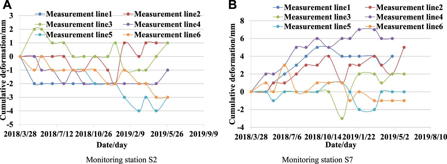 Displacement–time curve of the monitoring stations between exploration line 32-1 and exploration line 34. (A) Monitoring station S2. (B) Monitoring station S7.
