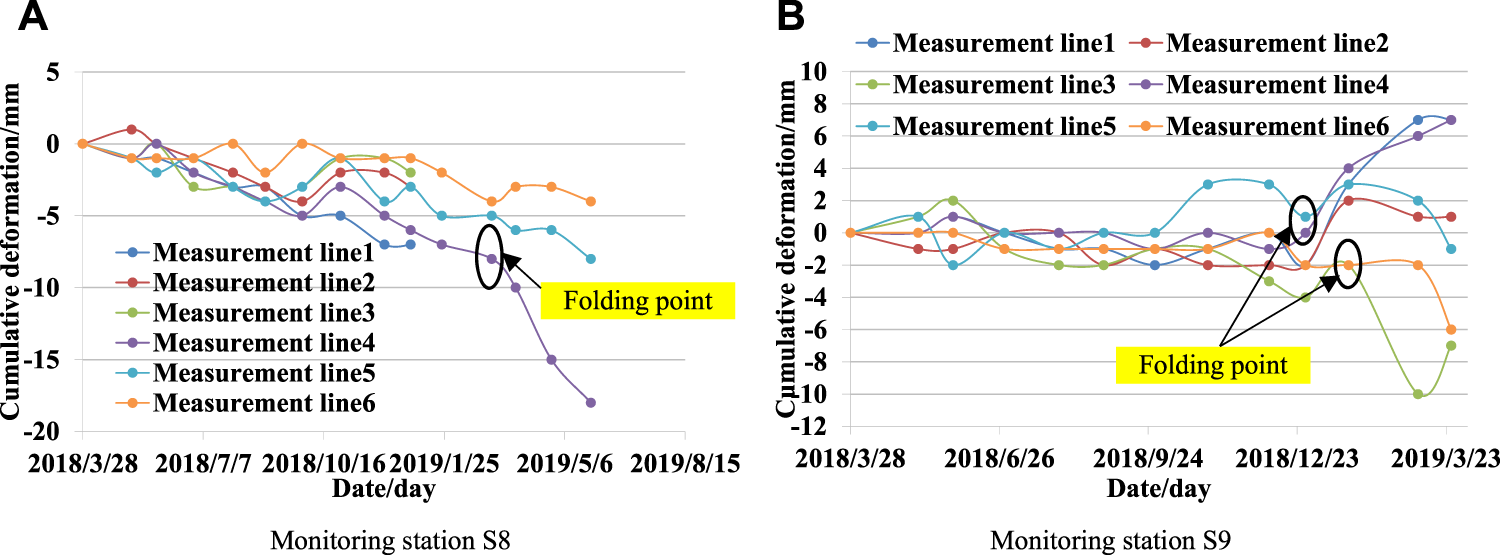 Displacement–time curve of the monitoring stations between exploration line 34 and exploration line 34-1. (A) Monitoring station S8. (B) Monitoring station S9.