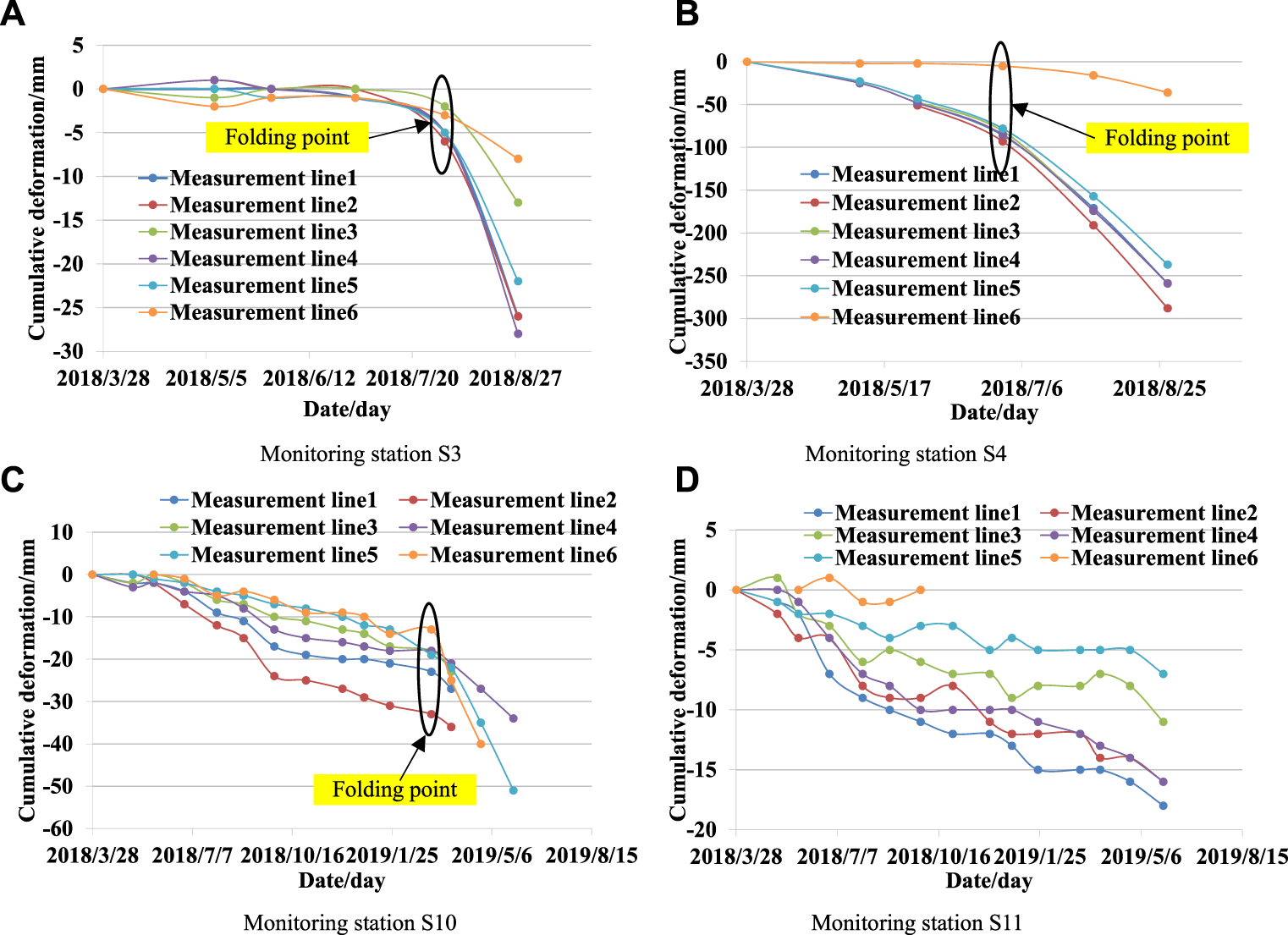 In a metal mine, the classification of deformation curve based on an apparent folding point which signifies the onset of rapid increases, can effectively help in determining the deformation and failure mechanism (Xia et al., 2016). According to the cumulative deformation characteristics of the six measurement lines in the monitoring stations, the cumulative deformation curves of the haulage drifts in hanging walls could be divided into three types: no folding, partial folding and whole folding. For example, the deformation curve of station S2 was in a fluctuating state, and the cumulative deformation of lines 1, 2, and 4 of station S3 increased slowly and linearly with time. There was no folding point followed by deformation acceleration in the deformation curve, and the largest cumulative deformation value in the two monitoring stations did not exceed 10 mm, meaning that the surrounding rock stability was good. In stations S8 and S9, parts of the measurement lines have folding points, including line 4 of station S8 and lines 1 and 4 of station S9. In these areas the joints were relatively developed, resulting in accelerating deformation without convergence at the part of the roadway section under the influence of mining-induced stress. It should be noted that, in the roadway sections of stations S3, S4, S10, and S11, the cumulative deformation curve belonged to the whole folding type. The six measurement lines had entered the accelerating deformation stage without convergence after appearance of the folding points. The maximum cumulative deformation at these four stations occurred on line 2 in station S4, and exceeded 280 mm. It was found that tensile deformation occurred more easily in roadway sections of the no-folding and the partial-folding types, because in these areas, most of the rocks surrounding the roadway had elastic and brittle characteristics and were little affected by mining stress. Generally, when the mining activity was below the roadway, the northern sidewall of the roadway moved toward the mined-out zone under the influence of the movement of the hanging wall. Roadway sections with folding type curves were more obviously affected by the steely anti-inclined structural planes under the influence of mining-induced stress. Therefore, the surrounding rock of the roadway showed great ductility and obvious convergent deformation, which was dominated by the buckling deformation of the bottom corner of the northern sidewall and the bending and toppling deformation of the southern sidewall.