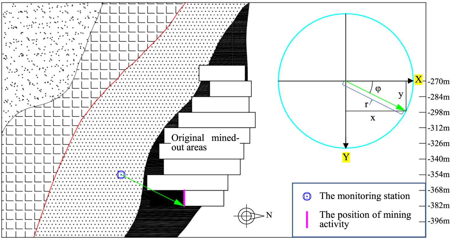 Relative position relationship between the monitoring station and the mining activity (section of exploration line 34).