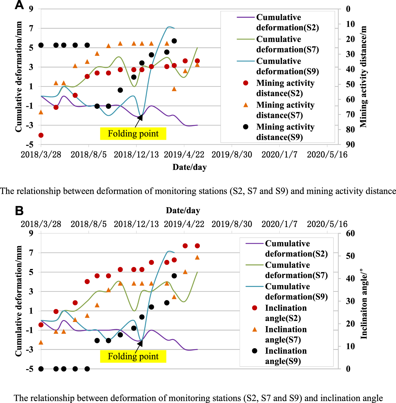 Relationship between deformation of monitoring stations (S2, S7, and S9) and mining under polar coordination system. (A) The relationship between deformation of monitoring stations (S2, S7, and S9) and mining activity distance. (B) The relationship between deformation of monitoring stations (S2, S7, and S9) and inclination angle.