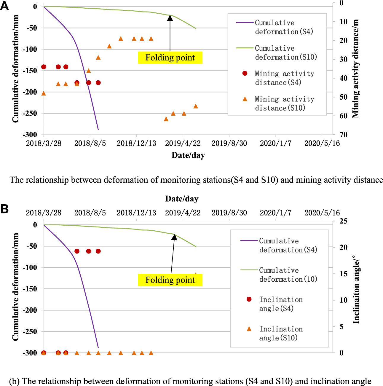 Relationship between deformation of monitoring stations (S4 and S10) and mining under polar coordination system. (A) The relationship between deformation of monitoring stations (S4 and S10) and mining activity distance. (B) The relationship between deformation of monitoring stations (S4 and S10) and inclination angle.