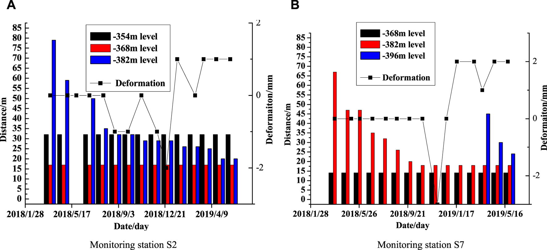 Relationship between deformation of monitoring stations (S2 and S7) and mining under rectangular coordination system. (A) Monitoring station S2. (B) Monitoring station S7.