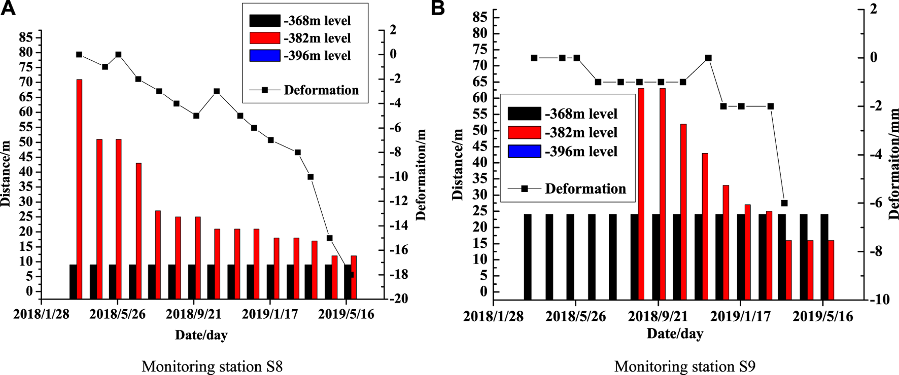 The deepest mining level experienced by the other six monitoring stations during the monitoring period was the first level below. During the monitoring period of S8 and S9, the nearby ore body at the -368 m sublevel was mined out, and the main mining activity was changed to -382 m. Obviously, the deformation at the two monitoring stations was in an elastic state at the beginning of mining at the -382 m sublevel. S8 showed a slow elastic deformation rate (<2 mm/month), and S9 showed no clear deformation (Figure 12). When the horizontal distance between mining activity and monitoring station reached a certain threshold, the stress of the rock mass surrounding the station exceeded the compressive strength and entered an accelerating stage of deformation without convergence or brittle failure. For example, in April 2019, when station S8 was 12 m away horizontally from the mining activity at sublevel -382 m, the deformation began to accelerate, exceeding 5 mm/month. At station S9, when the mining activity at sublevel -382 m was moved to a position 15 m away, the deformation accelerated and S9 was rapidly destroyed. The analysis above shows that the deformation acceleration without convergence of S8 and S9 occurred at the moment when the horizontal distance between the mining activity and the monitoring station was less than 12–15 m at -382 m (the first sublevel below the monitoring station).