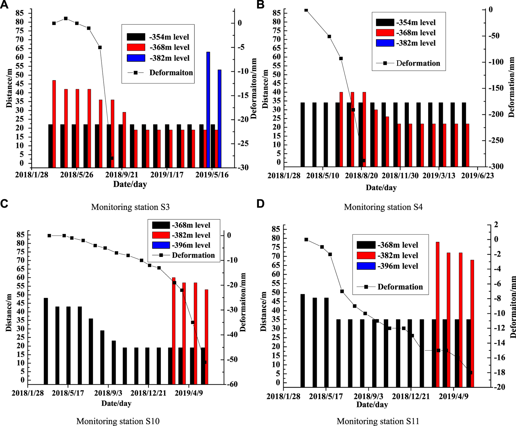 In February 2018, all eight groups of laser convergence meter monitoring stations at the -354 and -368 m levels were in operation, and the first deformation data was acquired in February. In March 2018, because of the steel pipe suspended on the side wall, the deformation data of measurement line 6 of S10 and S11 could not be acquired. The location of roof measurement points was redesigned in early May 2018. At the beginning of May 2018, monitoring station S4 was damaged by an on-site operation and could not be used until it was repaired in June 2018.