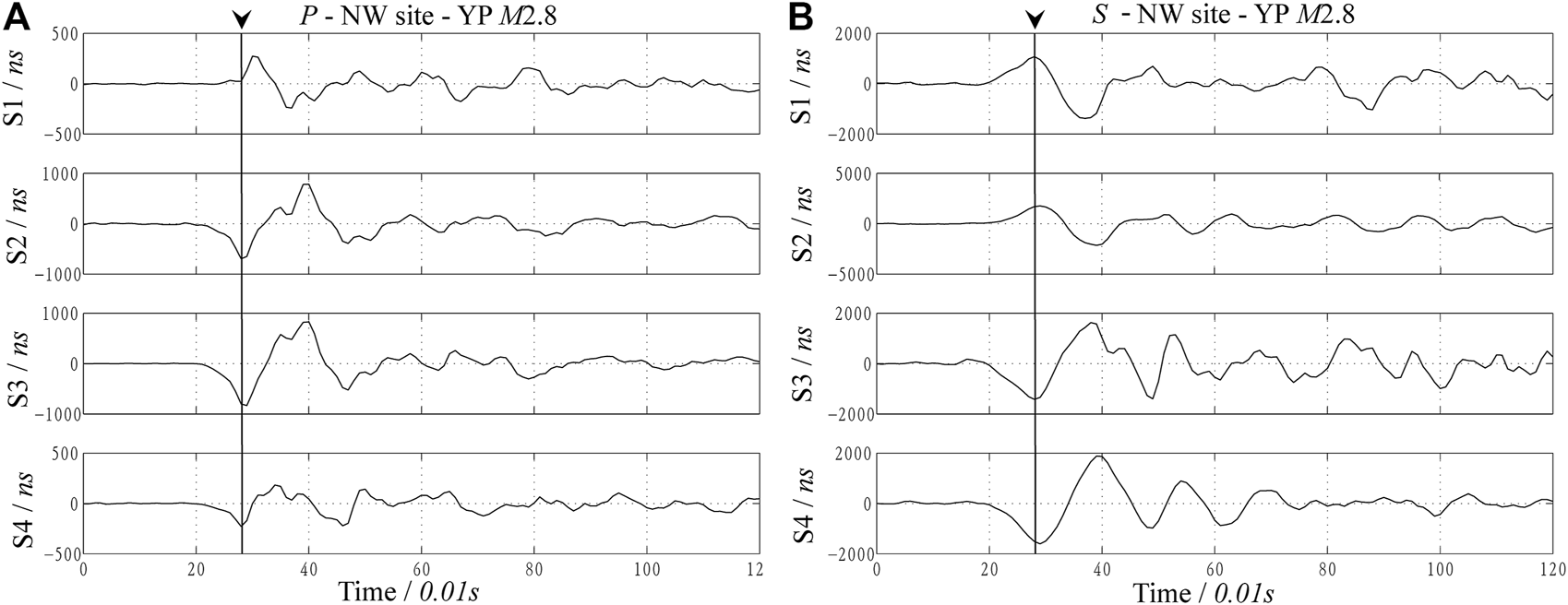 P (A) and S(B) waves of the M2.8 event were observed at the NW site.