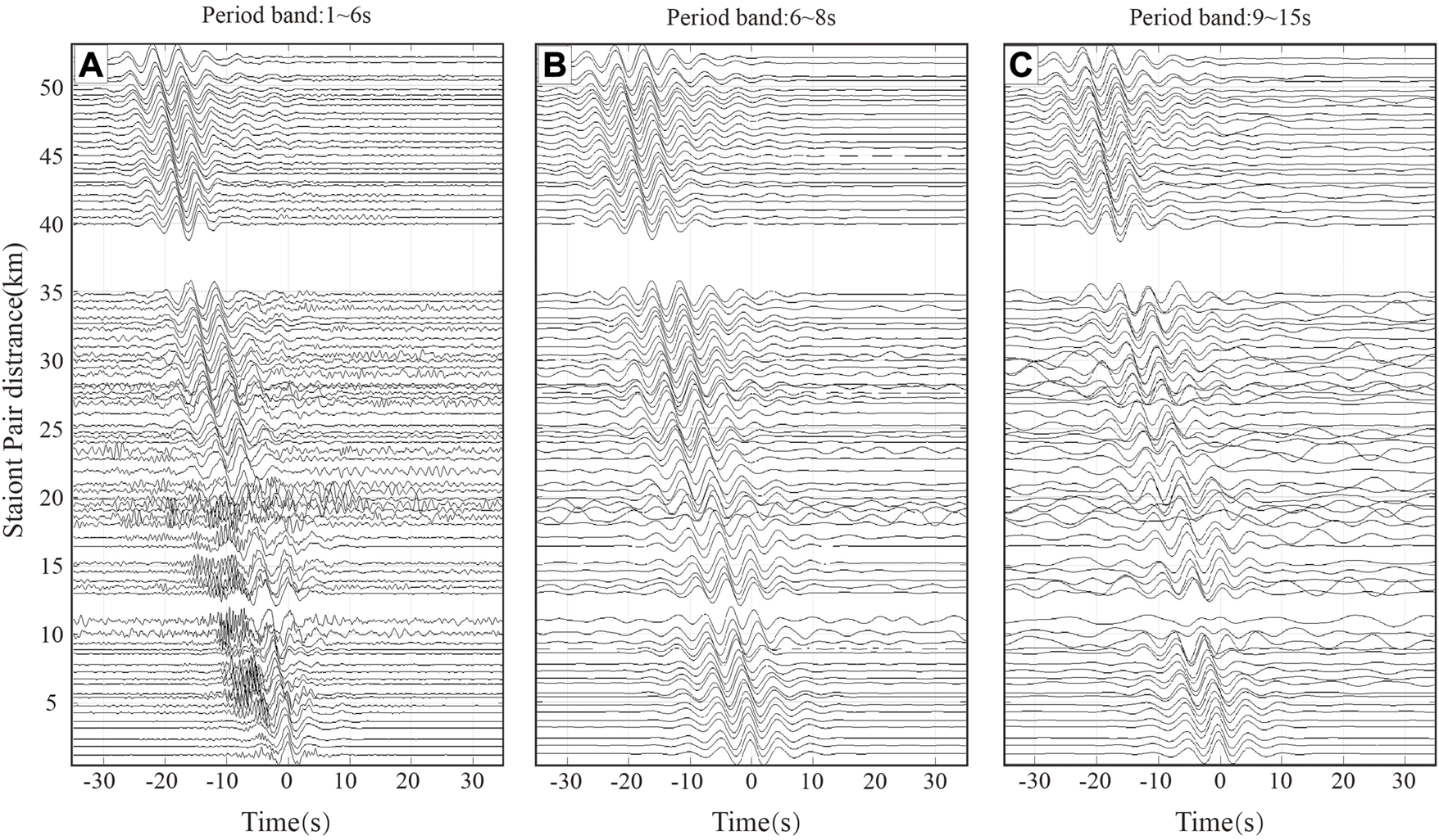 CCFs between station 2001 and other stations along Line 2. The original CCFs are bandpass-filtered in three bands with different periods: (A) 1–6 s (B) 6–8 s and (C) 9–15 s.
