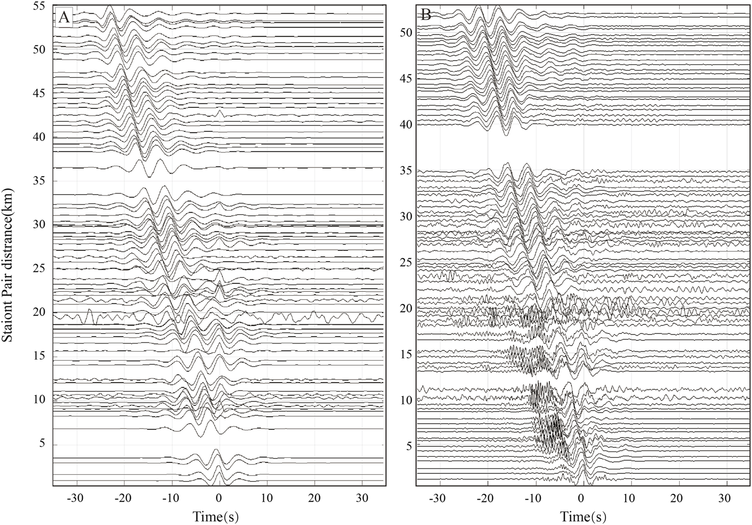 We first converted the FCNT format of the vertical component of the data into the SAC format. During the conversion, the integrity of the continuous data was checked. The continuous signal of one station is divided into hour-long segments. Then, mean value removal, linear trend attenuation and filtering were performed to eliminate the impact of zero drift and long-period trends in the data on subsequent data processing (Bensen et al., 2007). Low-pass filtering was carried out to obtain signals below 5 Hz, and the data were resampled down to a 100 ms sampling interval. We normalized the data in the time domain to reduce the impact of seismic signals. Then, the data were whitened to weaken the influence of some continuous monochromatic sources and balance the strength of signals at various frequencies.