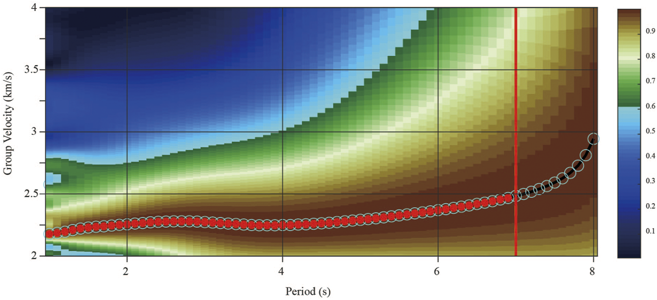 Group velocity dispersion extraction using the image transformation technique. The color bar represents the normalized surface wave envelope amplitude. Gray circles represent dispersion points satisfied with the chosen conditions, and solid red points are the final reserved dispersion points.