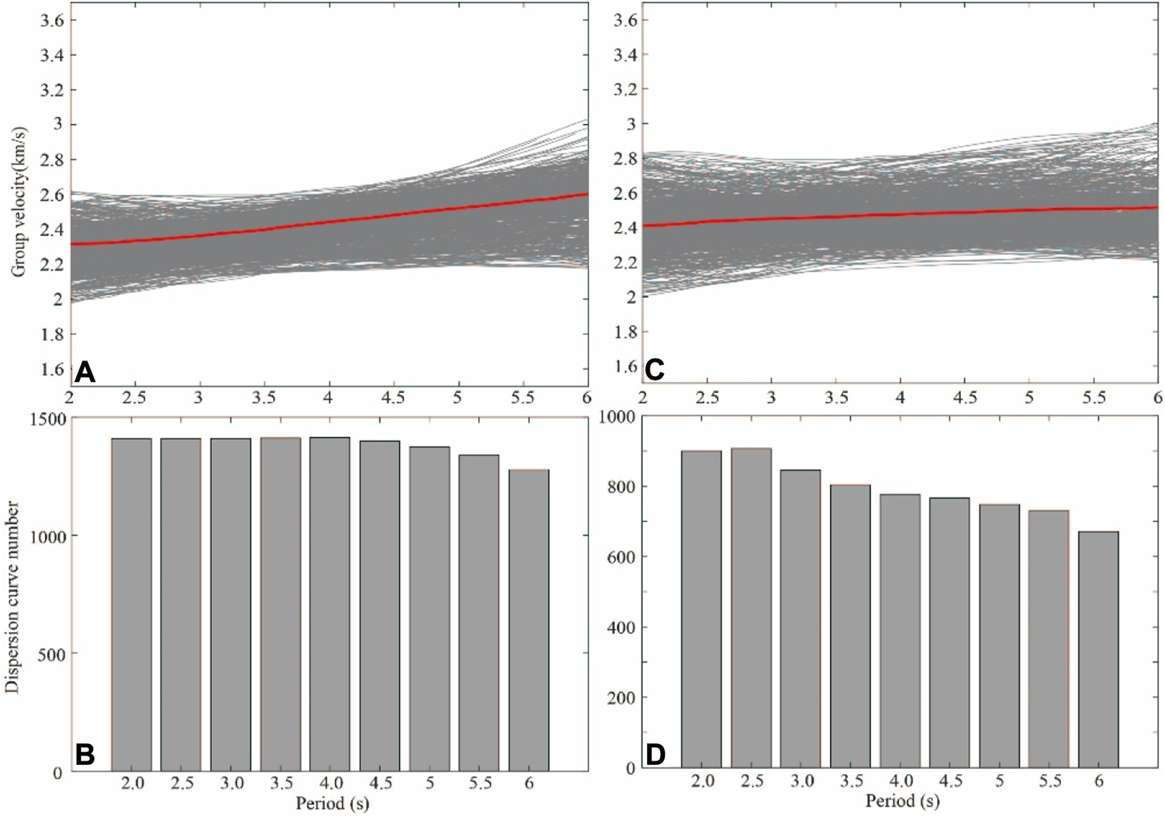 Group velocity dispersion extraction results. (A,C) are the group velocity dispersion curves extracted from the EGFs in Line 1 and Line 2, respectively. The red solid line denotes the average velocity dispersion curve of all station pairs. The gray solid lines show randomly selected dispersion curves. (B) and (D) are the number of phase velocity dispersion nodes at each period for Line 1 and Line 2.