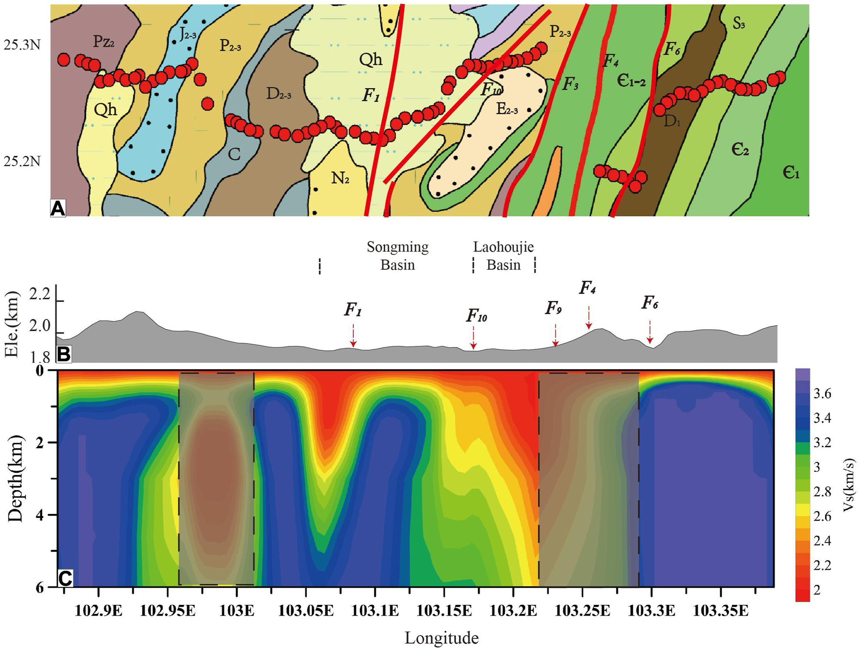 The shape of the Yiliang Basin is irregular. The dominant faults are F1 on the north side and F2 on the south side. The Songming Basin has a high-velocity anomaly area. Previous studies have considered that the Songming area is an area of uplift (Teng, 1978). The regional crustal movement in the Cenozoic era has been mainly characterized by large-scale uplift. There is strong horizontal differential movement along the fault, while vertical differential movement is still weak. The movement is mainly shown in the step area of the secondary shear fault (Song et al., 1997).