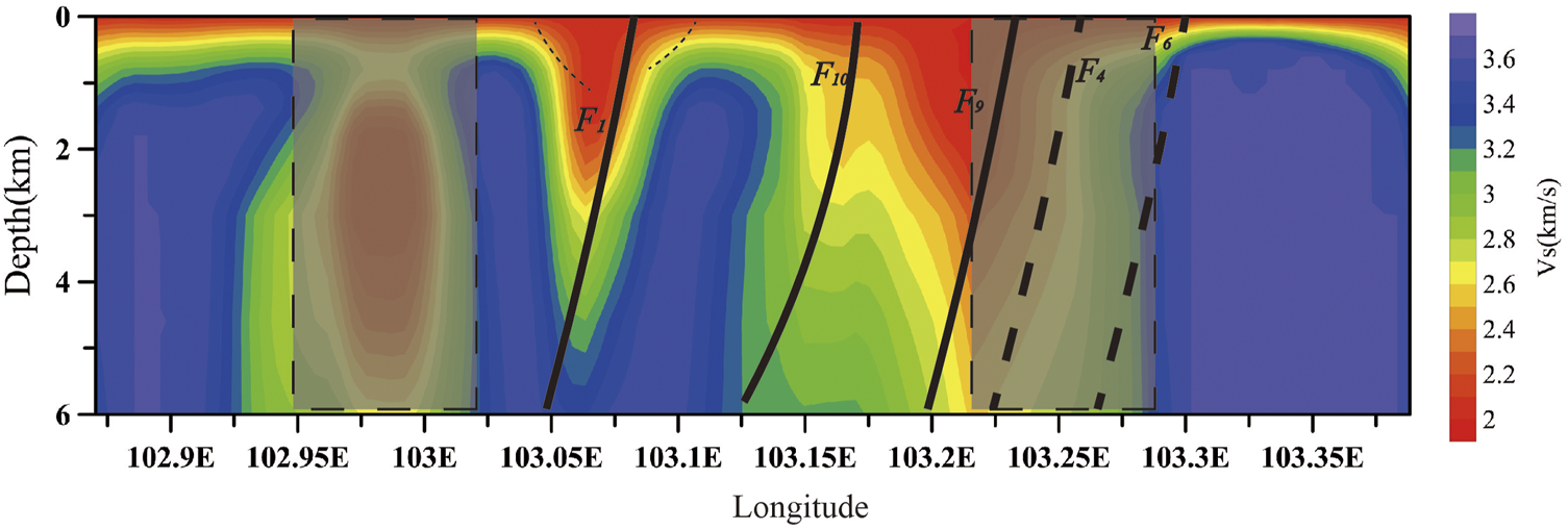 The velocity corresponding to the subfaults (F1∼F8) of the XJFZ is relatively low, i.e., generally 2 km/s, indicating that a strong compression fracture zone along the fault was formed in the process of left-lateral strike slip. At the same time, the LV areas usually show nearly vertical dips with a slightly eastward tilt. The fault dip direction is consistent with the tectonic stress direction in the area. The results illustrate that the depth of the secondary faults of the XJFZ extends to 6 km. According to deeper imaging studies, the eastern‒western branch converges at a depth of approximately 25 km and cuts through the whole crust (Chunyong et al., 2009). F4 and F8 in this area are north of the faults (Figure 2), which may be shown as the junction between high and low velocities (black dashed line in Figure 11). Combined with the velocity structure inversion in this paper, we conclude that the lateral variation in the velocity structure of the upper crust in the study area is strong, showing obvious strike-slip brittle deformation characteristics, and the fault dips are nearly eastward.