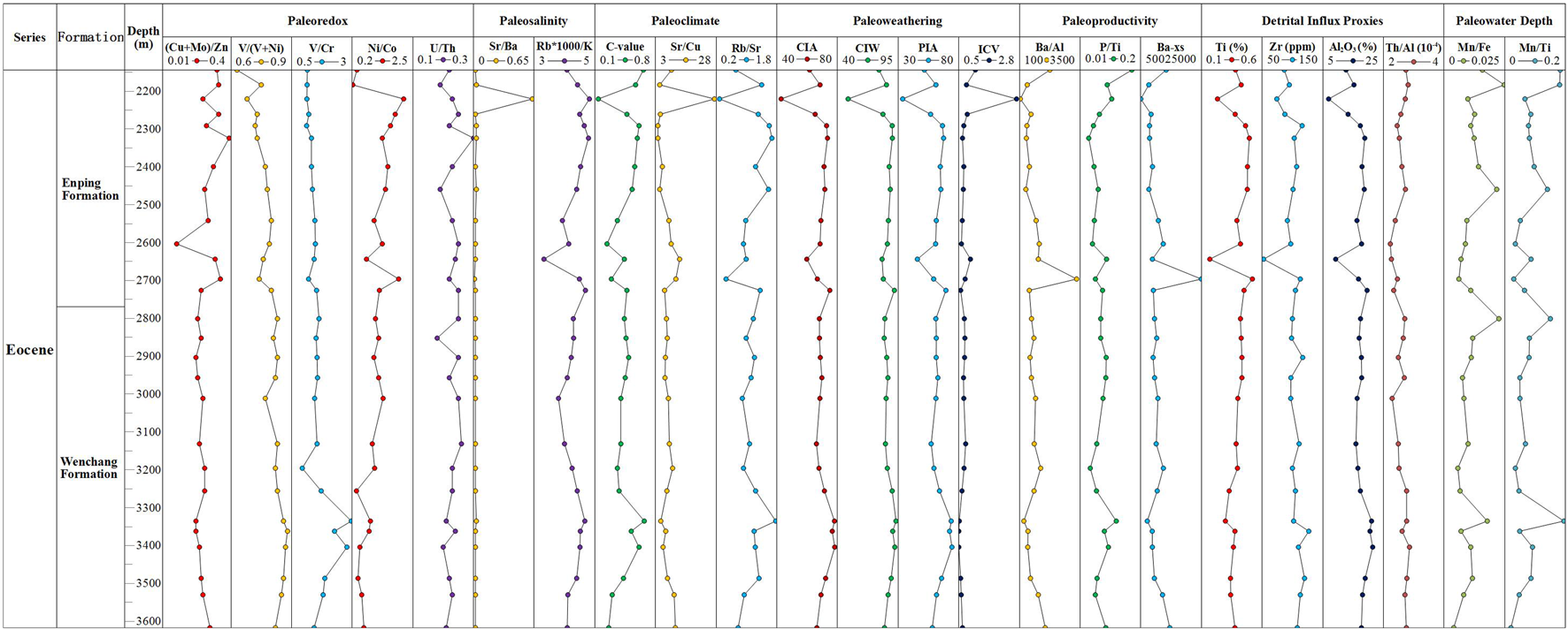 In this paper, the elemental geochemistry of the Eocene Wenchang and Enping sediments in the Baiyun sag is analyzed by X-ray diffraction (XRD) and inductively coupled plasma-mass spectrometry (ICP-MS). On this basis, the paleoredox, paleosalinity, paleoclimate, paleoweathering, and paleoproductivity are discussed, and the principal mechanisms of organic matter enrichment and the depositional environment are discussed.