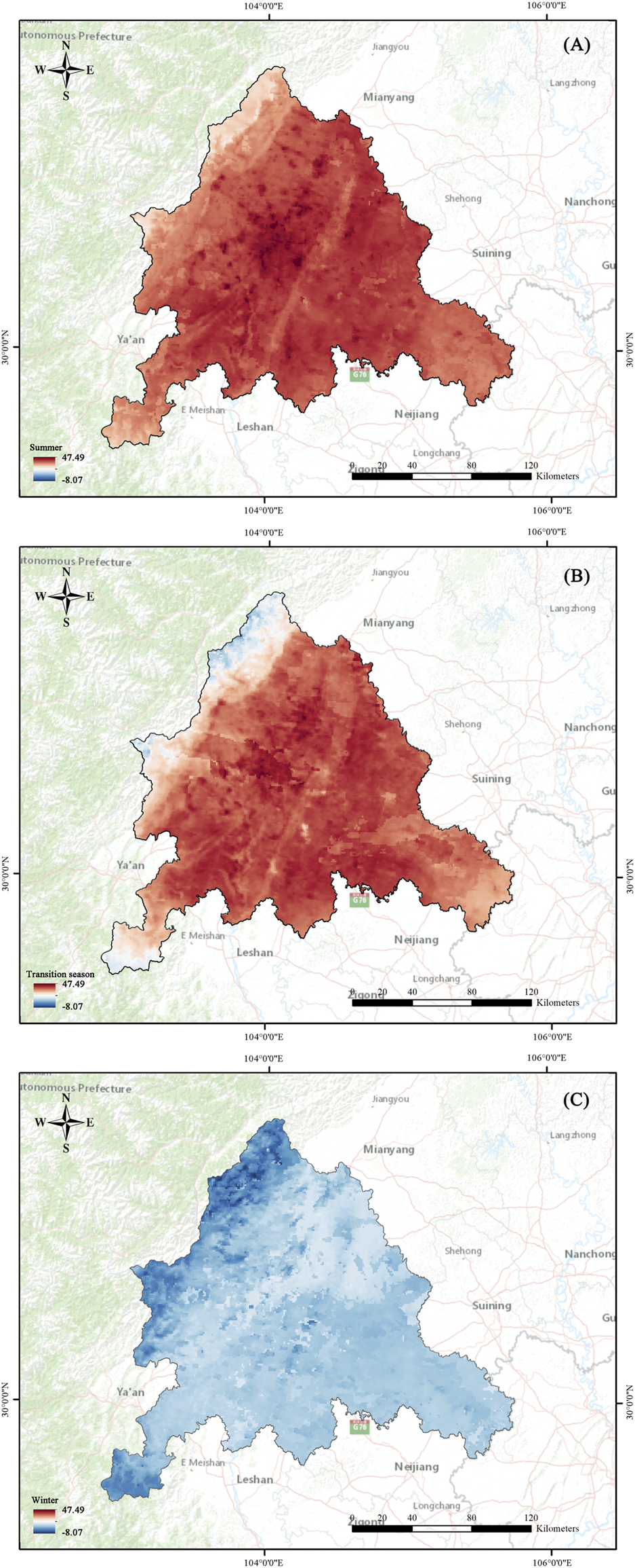Spatial pattern of LST in Chengdu metropolitan area in different seasons: (A) summer (B) transition season (C) winter.