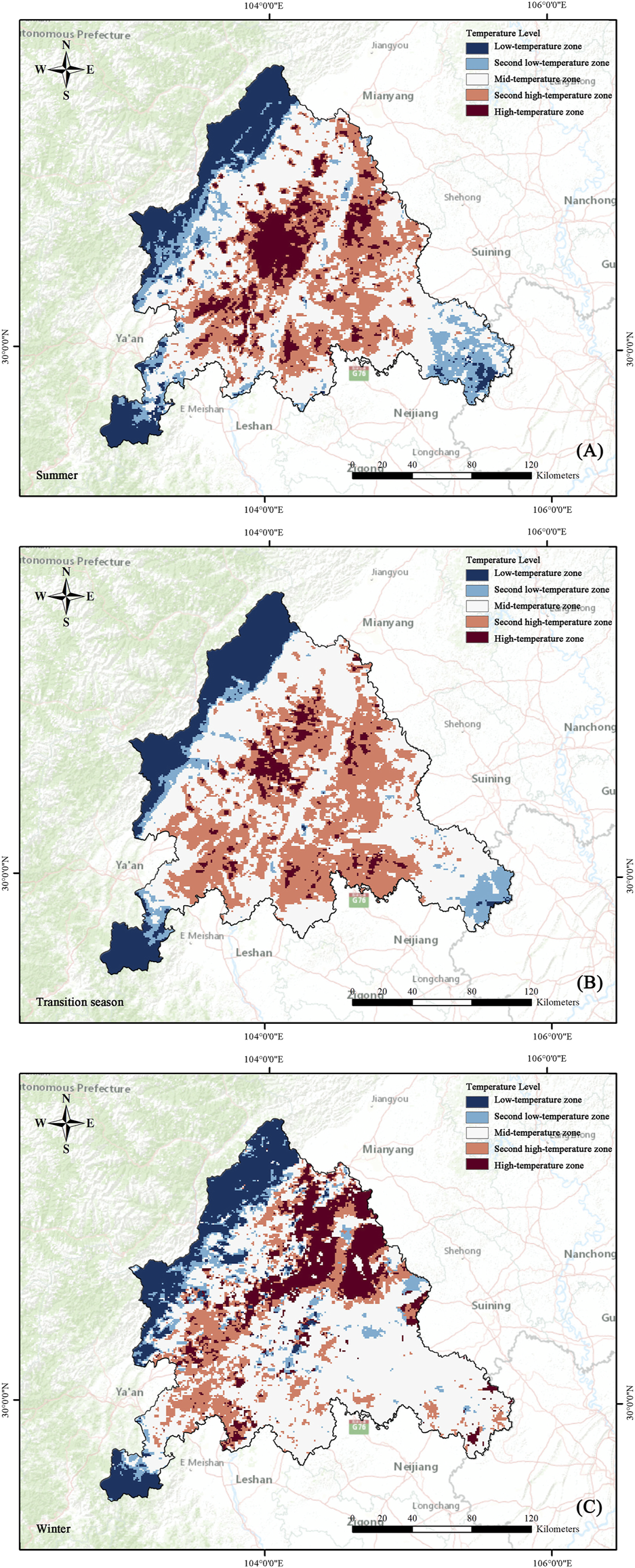 Spatial distribution of heat islands in Chengdu metropolitan area in different seasons: (A) summer (B) transition season (C) winter.