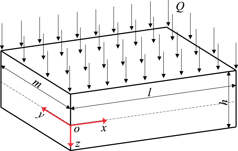With the mining of the mining-induced seismicity working face, the overhanging area of the key stratum increases, causing damage at the fracture boundary of the goaf. The boundary around the key stratum moves to a plastic hinged state, and the boundary conditions change from four edges clamped support to four edges simple support. However, at this time, the key stratum as a whole is not damaged, but the boundary constraint is weakened. When it is affected by mining, fracture instability will occur. Accordingly, the key stratum is simplified as four edged simply supported rectangular thick plate subjected to uniform load, as shown in Figure 4. The Cartesian coordinate system is established with the intersection point of the neutral surface of the key stratum as the origin o. The x direction is the advancing direction of the working face, the y direction is the inclined direction of the goaf, and the z direction is the height direction. In the figure, Q is the self-weight stress of the overlying strata of the key stratum (including its own thickness), l is the overhanging length of the key stratum in the advancing direction of the working face, m is the overhanging width in the inclined direction of the goaf, and h is the thickness of the key stratum.