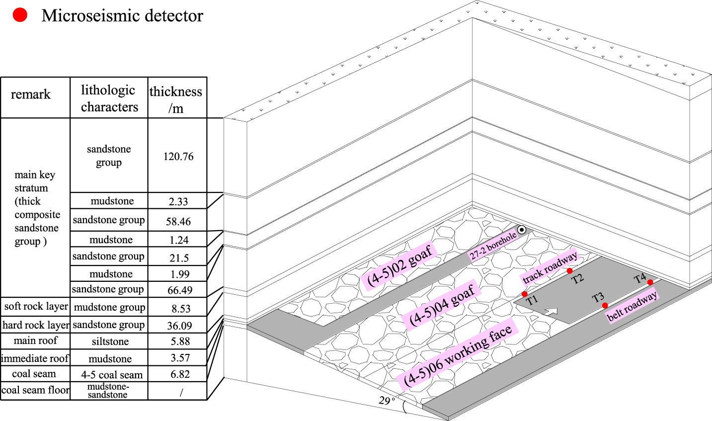 Liuhuanggou Coal Mine (4-5) 06 comprehensive caving working face is adjacent to the (4-5) 04 mining area and the (4-5) 02 mining area. The designed strike length is 1726.5 m and the inclination length is 183 m. The working face is mining a 4-5 coal seam. The coal seam inclination angle is 25°∼33°, average 29°, the coal seam thickness is 6.24∼6.92 m, and the average thickness is 6.52 m. The working face elevation is +777.5∼+716.3 m, and the surface elevation is +1,135.5∼+1,242.5 m. The (4-5) 06 working face open cut is outside the (4-5) 02 working face open cut by approximately 650 m, as shown in Figure 7 According to the coal-rock rockburst tendency identification, the 4-5 coal seam, the roof strata, and the floor strata all have a weak rockburst tendency, among which the single axis compressive strength of the 4-5 coal seam is 13.34 MPa. The structural characteristics of the roof strata of the 4-5 coal seam obtained from the column diagram of hole 27-2 of the mine are shown in Figure 7. The roof strata of the 4-5 coal seam is dominated by siltstone, with a total of five sandstone groups from the main roof to the surface, with mudstone of varying thickness distributed between the layers. A microseismic monitoring method records the energy released by the coal and rock mass fracture and vibration induced during the mining process to analyze and determine the direction of vibration propagation, accurately locate the source location, and calculate the energy. The mine has installed the ARAMIS M/E microseismic monitoring system, and at least 4 microseismic detectors have been installed while mining the (4-5) 06 working face, which can monitor the rockburst hazard areas of different levels. The ARAMIS M/E microseismic monitoring system integrates a digital DTSS transmission system, collecting data for mine vibration positioning, vibration energy calculation, and vibration hazard assessment. Sensors (sensors or other) monitor vibration events and process them into digital signals, which are then transmitted to the ground by the digital signal transmission system DTSS. The system can monitor vibration events with a vibration capacity greater than 100J, a frequency range of 0∼150 Hz, and less than 110 dB (anti-interference ability). According to the different monitoring ranges, the system can choose sensors with different frequency ranges. The data transmission system allows for the transmission of three-dimensional vibration rate change (X, Y, Z) signals through a long-distance transmission cable. The system provides the conversion and recording of vibration signals through a 24-bit σ-δ converter, and completes continuous and real-time vibration monitoring based on the recording server. The standard version of the system software provides one monitoring signal for each channel; The optional 3-channel signal monitoring for each channel requires non-standard software that can monitor microseismic activity in three directions.