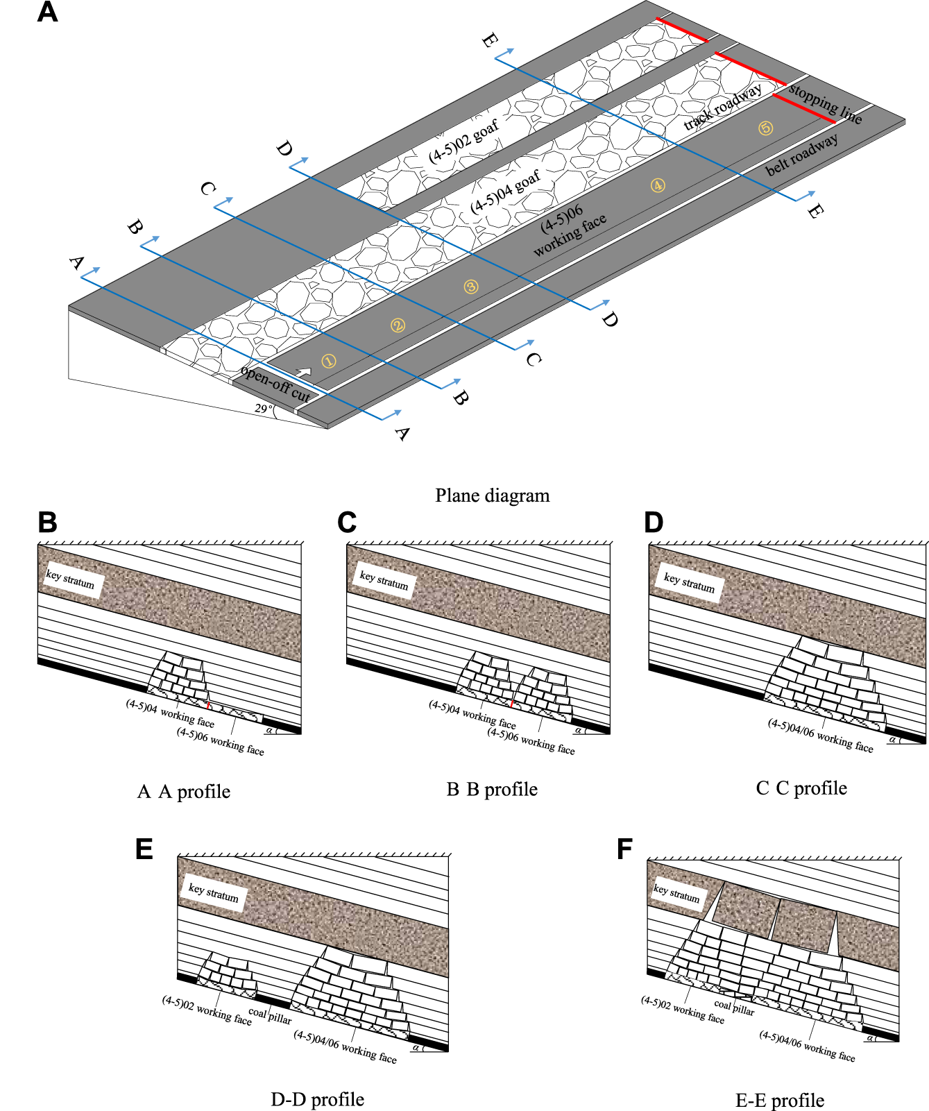 FIGURE 8. Schematic diagram of the dynamic evolution of the overlying strata spatial structure during the whole process of mining in (4-5) 06 working face. (A) Plane diagram (B) A-A profile (C) B-B profile (D) C-C profile (E) D-D profile (F) E-E profile.