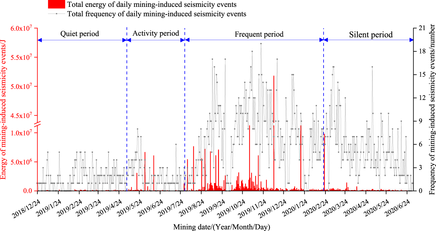 FIGURE 9. Time series characteristics of mining-induced seismicity activity in (4–5)06 working face.