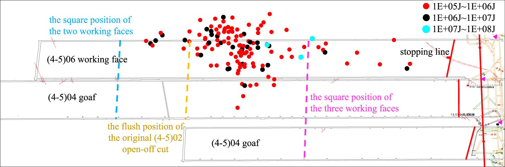 FIGURE 10. Planar projection of high-energy mining-induced seismic events in the (4–5) 06 working face.