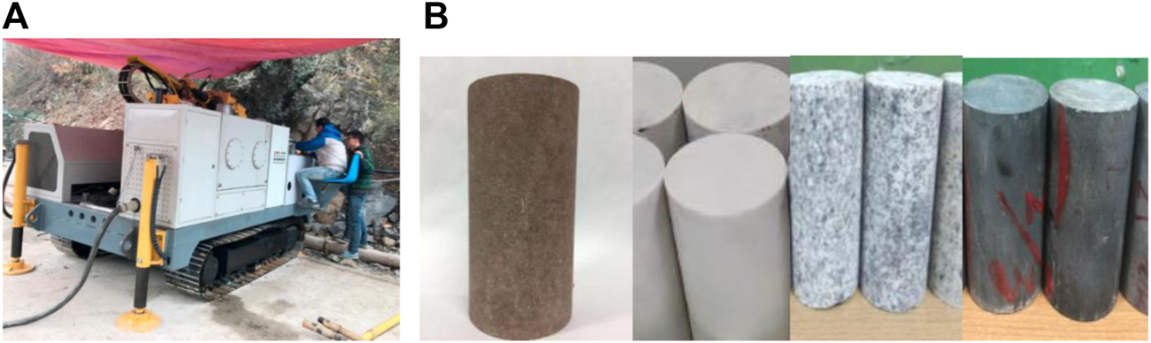 The XCY-1 rock mechanics parameter drilling system developed by Xi’an University of Technology was used in this digital drilling test (Figure 3A). The instrument comes with a crawler hub, which can meet most field drilling operations. The instrument consists of six parts. Including: electrical control system, hydraulic system, oil pump transmission system, real-time monitoring system, data acquisition control system and diamond drill bit. The inner diameter of the drill is 50 mm and the outer diameter is 60 mm. The instrument is divided into two modes: ordinary drilling and parameter acquisition. Among them, the ordinary drilling mode is suitable for the pre-drilling stage before the test depth. The parameter acquisition mode is suitable for the accurate acquisition of digital drilling parameters. The operating parameters of the instrument are set according to the geological exploration report data. The digital drilling system runs intelligently according to the operating parameters. During the drilling process, the system records the thrust, torque, rotational speed and drilling speed at different depths. During the drilling process, the loading servo motor and the torque servo motor operate independently. The two motors provide a maximum thrust of 18 kN and a maximum torque of 2458 Nm respectively. The instrument can accurately measure thrust, torque and drilling depth through self-control. In the test, the ROP (w) and ROP (v) are used as control parameters, and the thrust and torque can be obtained at the same time. As the drilling depth increases, it can automatically save the job data in an Excel file. The maximum acquisition capability of 500 pieces of data per second enables the device to accurately store hundreds of sets of data.