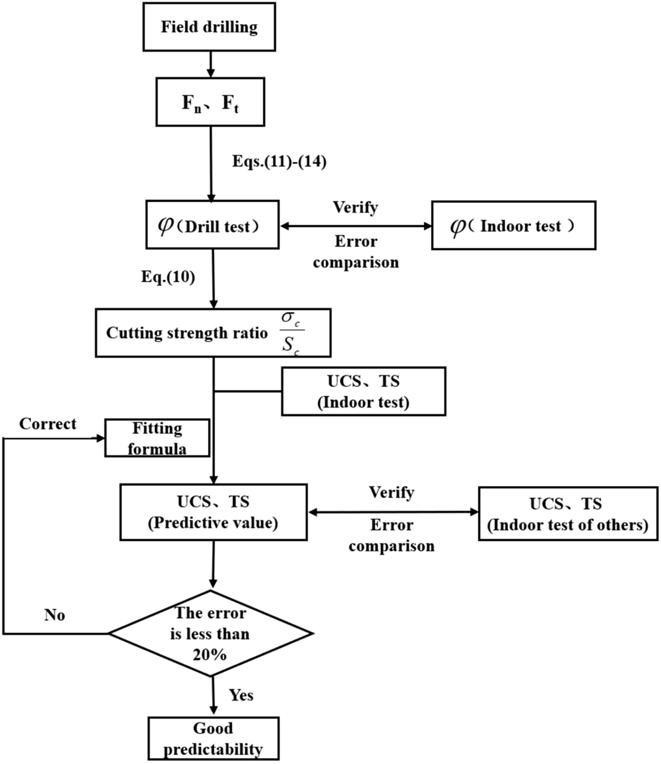 According to the mechanical balance of the drill bit, the analysis model of the drill bit is established in this paper. Drilling tests were performed on four rocks using a digital drilling system. By analyzing the relationship between the bit parameters, a method is proposed for predicting the rock internal friction angle. There is a correlation between rock internal friction angle and uniaxial compressive and tensile strength. The correlation between rock cutting strength ratio and uniaxial compressive strength and tensile strength was analyzed based on the analytical model. Finally, according to the fitting formula of rock cutting strength ratio and two strengths, a new method to determine rock strength is proposed. The reliability of the method is verified by comparing the predicted strength with the measured value of the laboratory test strength. The flowchart of the research contents of the article is shown in Figure 1.
