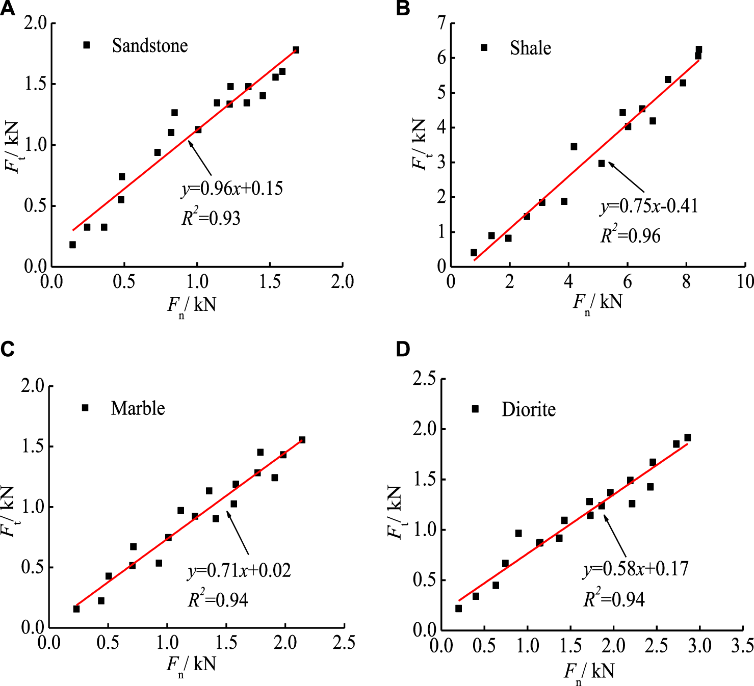 As the depth of penetration of the drill into the rock continues to increase, the thrust and torque forces of the drill also increase. After linear fitting, the fitting degrees of thrust and torsion of the four kinds of rocks are all above 90%, reflecting the good correlation between the two. The during the drilling process of the four rocks corresponding to sandstone, marble, shale and diorite is 0.96, 0.71, 0.75 and 0.58, respectively. According to Eq. 11, where a=5°, combined with Eqs 10–14, the internal friction angles of marble, sandstone, shale and diorite under the digital drilling test can be obtained. The internal friction angles are 33.6°, 41.9°, 43.6° and 50.8°, respectively.