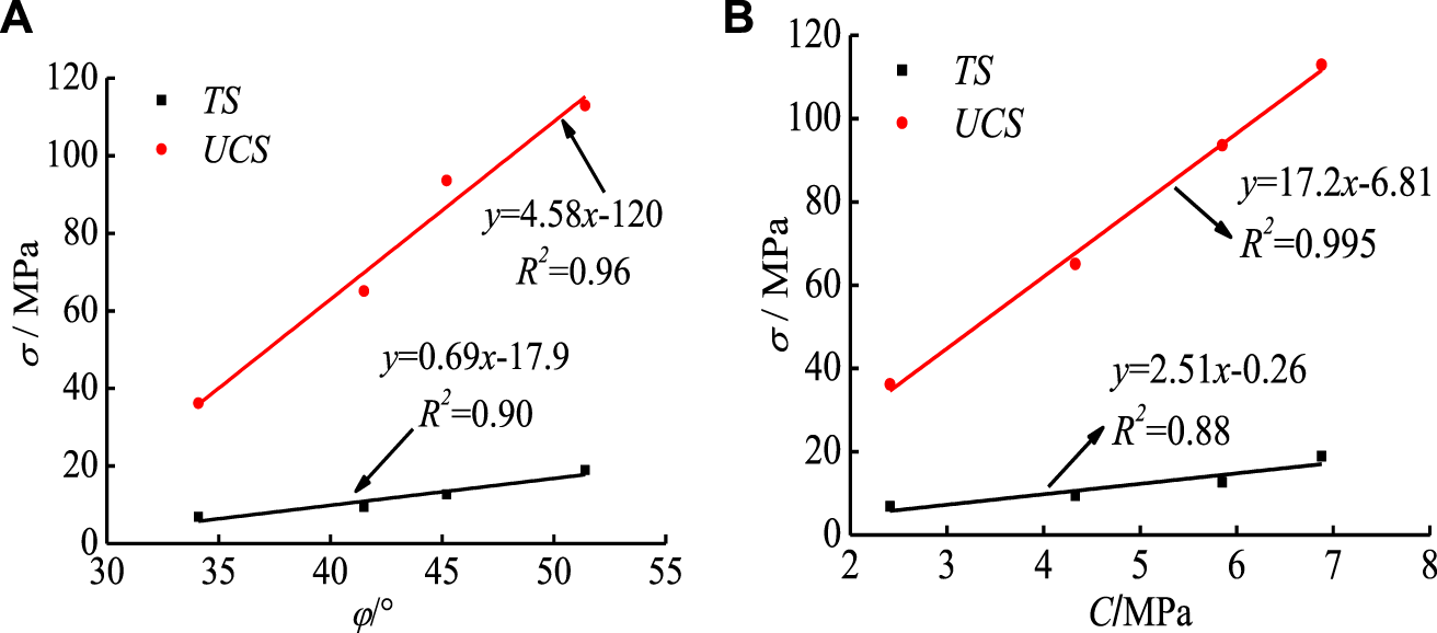 Through laboratory tests, the physical properties and mechanical indexes of four kinds of rocks were measured. The basic physical and mechanical parameters of rocks are shown in Table 1. According to the data in Table 1, the relationship between rock strength, internal friction angle, and cohesion is analyzed, as shown in Figures 6A, B. It can be seen from Figure 6A that with the increase of the internal friction angle, the uniaxial compressive strength and tensile strength of the rock both increase. The compressive and tensile strengths and the internal friction angle of the four kinds of rocks are linearly fitted, and the fitting equations are obtained. The fitting degrees are R2=0.96 and R2=0.90, respectively, indicating that the rock strength has a good linear correlation with the internal friction angle. Among them, the uniaxial compressive strength of the rock is much greater than the tensile strength. The slope of uniaxial compressive strength as a function of internal friction angle is also greater than that of tensile strength. After relationship fitting, the fitting equations of rock compressive strength, tensile strength and cohesive force are obtained. The fitting degrees are R2 = 0.99 and R2 = 0.88, respectively, indicating that the rock strength and cohesion are linearly related (Figure 6B).