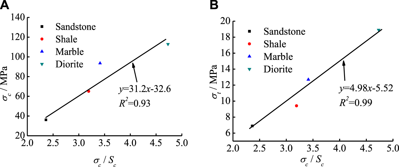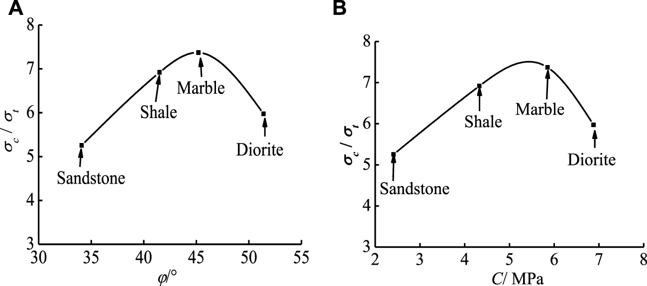 As shown in Figures 7A, B, the ratio of uniaxial compressive strength and tensile strength of rock with internal friction angle (Figure 7A) and cohesive force (Figure 7B) first increases and then decreases. The value of the internal friction angle and cohesion of sandstone is the smallest, and the corresponding strength ratio is also the smallest. Diorite has the largest internal friction angle and cohesion value, as well as its uniaxial compressive strength and tensile strength. But the ratio of uniaxial compressive strength to tensile strength of diorite is not the largest. The ratio of uniaxial compressive strength to tensile strength of marble is the largest.
