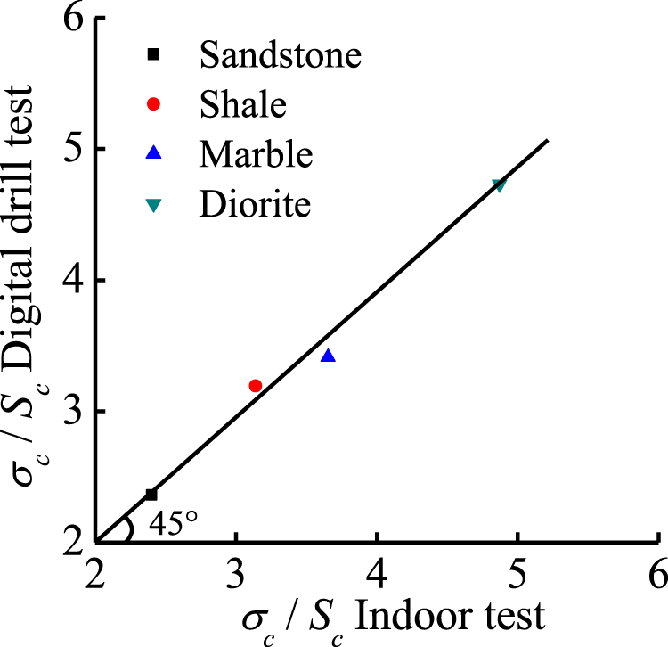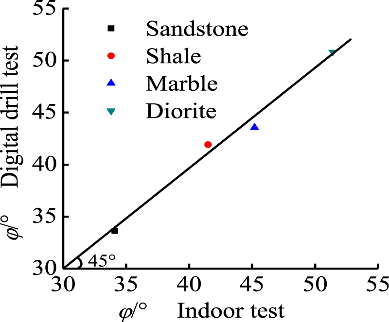 The internal friction angles of marble, sandstone, shale and diorite were obtained through digital drilling tests. This is compared with the rock internal friction angle measured in a standard laboratory, as shown in Table 2.