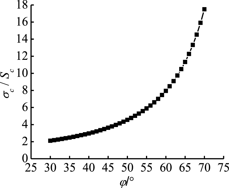According to the laws of mechanical parameters of rocks in practical engineering, the value of the internal friction angle ranges from 30° to 70°. According to Eqs 10–14, the change of the strength ratio under different internal friction angles is further analyzed. As shown in Figure 10, when the rock internal friction angle is 30°, the cutting strength ratio is 2.10. when the internal friction angle is 70°, the cutting strength ratio is 17.5. The rock strength ratio increases with the increase of the internal friction angle, and the increasing range keeps increasing.