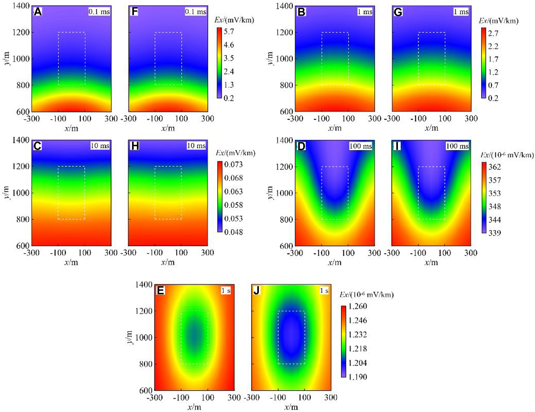 Therefore, by calculating the TEM response of a relatively simple model for electrical resistivity with isotropy, we can confirm that by analyzing the changes in EM signals collected during multiple segmented fracturing processes, it is possible to identify anomalies in the target zone of the fracturing fluid. However, when a large amount of water or fracturing fluid is injected into reservoir layers, the fluid flows along microfractures and continuously expands the fractures. This process may lead to an increase in the porosity and permeability of the reservoir and causes anisotropy (Kirkby et al., 2016). Therefore, it is essential to study the characteristics of TEM responses in anisotropic media during fracturing monitoring processes. In the future, we will focus on the TEM response forward modeling of anisotropic electrical models.