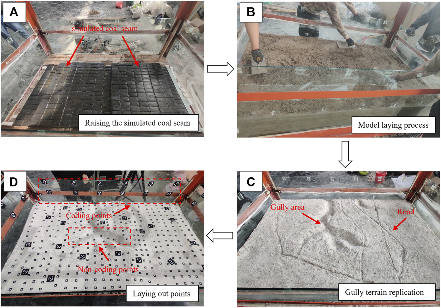 Model building process, (A) raising the bottom of the device to simulate coal seams, (B) laying simulated rock layers, (C) replicating real topography, (D) laying coded and non-coded points.