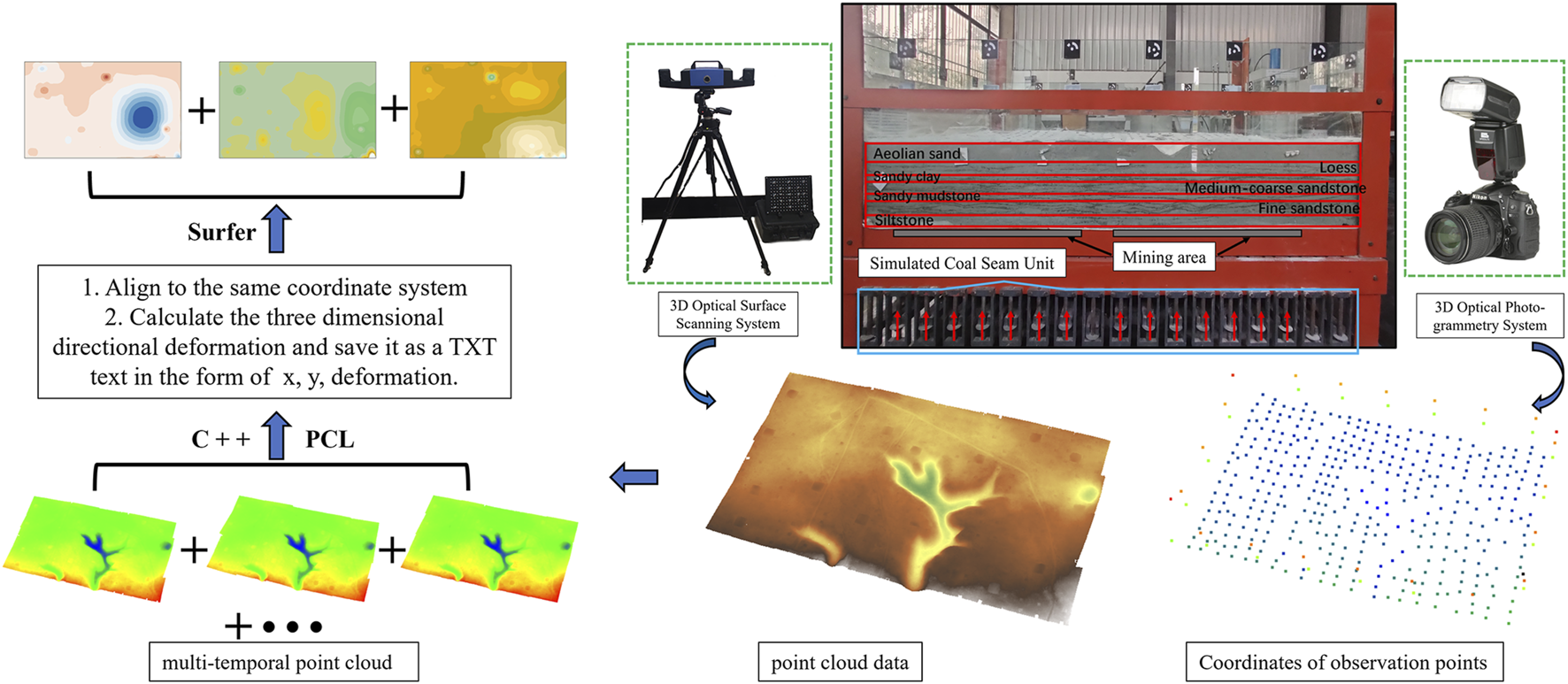 The mining process was simulated by adjusting the knob at the bottom of the device to make the coal seam sink, and the model was mined every 5 h, advancing 10 cm each time, mining working face I first and then working face II, divided into a total of 14 mining stages. The longer and the shorter sides of the device were aligned with the strike and the tendency of the coal seam. As shown in Figure 6, the deformation damage of the ground surface during coal seam mining was continuously observed using a 3D optical photogrammetry system and a non-contact 3D optical surface scanning system, with the 3D optical photogrammetry system observing every 10 cm of advancement and the 3D optical surface scanning system observing every 30 cm of advancement; a total of 2,514 photographs, as well as 6 periods of point cloud data were obtained. Each phase of the point cloud data contained approximately 28 million points, and the average point spacing was concentrated at about 0.5 mm. The point observation accuracy of the 3D optical photogrammetry system was up to 0.064 mm, and that of the 3D optical surface scanning system was up to 0.05 mm, which was at a sub-millimeter level and met the test requirements.