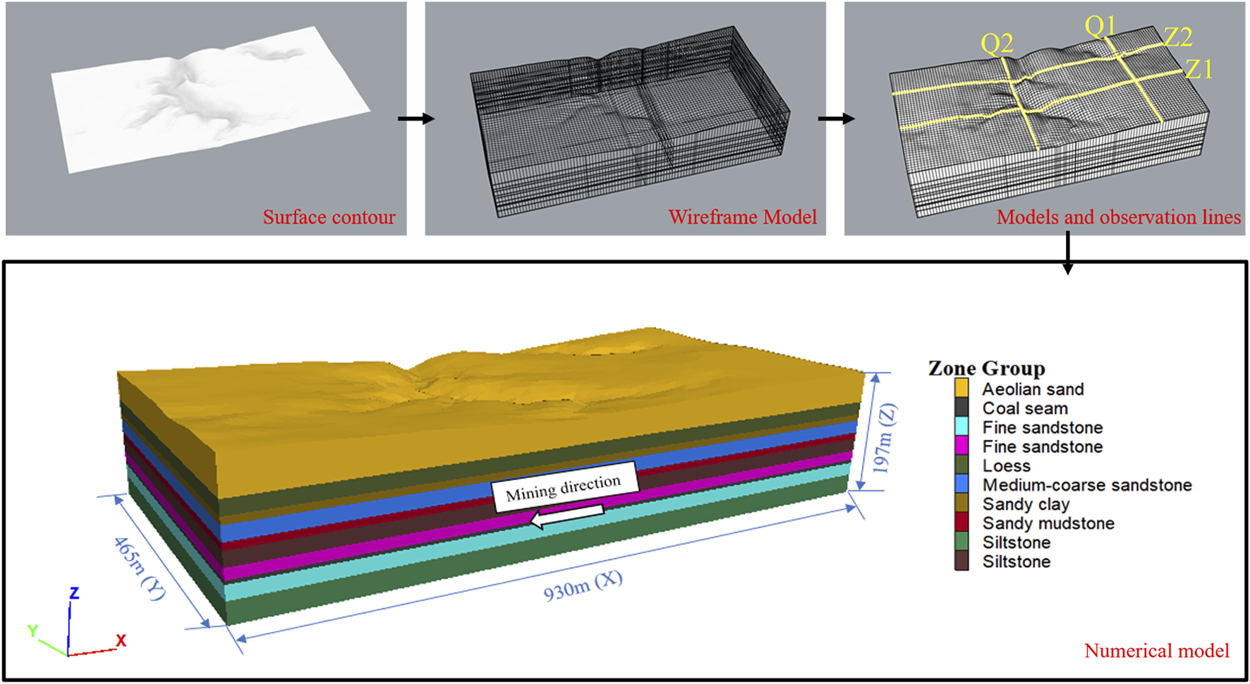 In order to study the moving and deformation law of the mine in three-dimensional space more deeply, FLAC3D (Fast Lagrangian Analysis of Continua) software was used to simulate and analyze the shallow-buried coal seam mining in the gully area. The similarity ratio between the numerical model and the prototype of the mining area was 1:1, and the model was built according to the actual situation in the study area, where the rock dip was small and close to horizontal, so the model stratum was set to be horizontal. Figure 7 shows the model-building process, which was pre-processed and model-layered using Rhinoceros software, and then imported into FLAC3D. We excluded the parts of the model reconstruction that resulted in distorted effects due to missing contour lines. The model region included two complete working faces. The final model dimensions were 930m × 465m × 197 m (length × width × height), with a tetrahedral mesh type consisting of 142,920 grid points and 798,446 cells. The simulated coal seam depth was 127m, with a mining thickness of 5 m. According to the stratigraphy revealed by the geological section map of the mining area, and by synthesizing the parameters of the physical and mechanical indexes of the rock materials, the numerical model strata in the study area were divided into 10 rock groups according to lithological properties and completeness. The distribution of the numerical model stratigraphy and the main mechanical parameters are shown in Table 2.