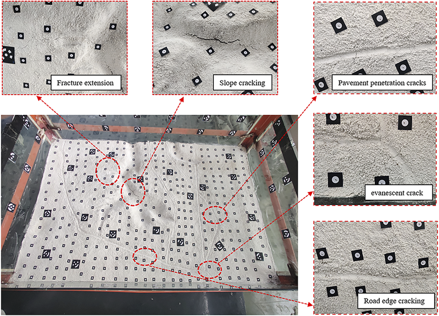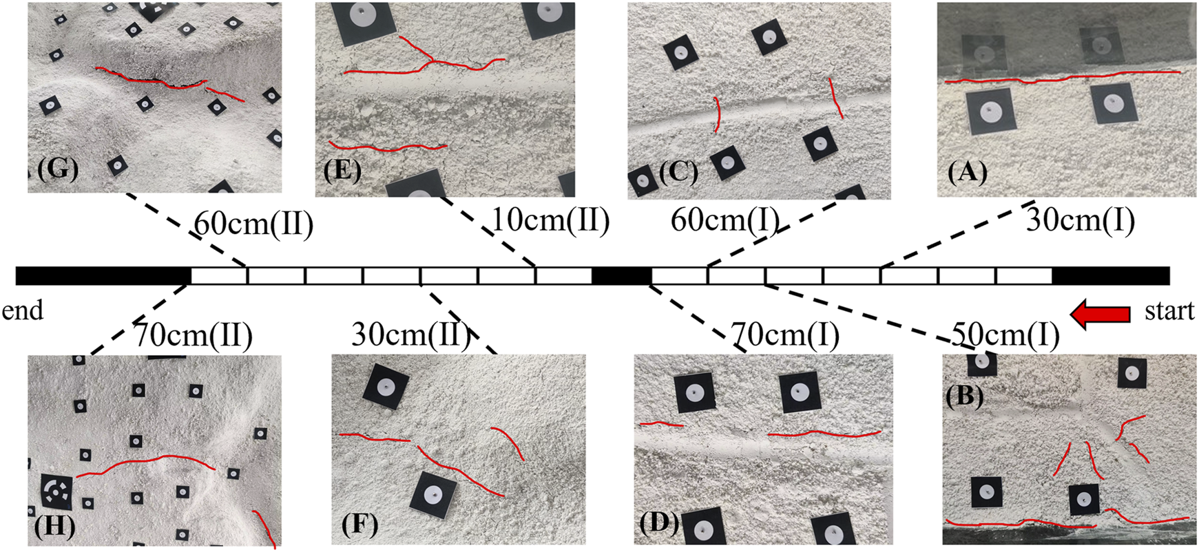 Fracture development process, (A) model edge crack, (B) quadratic development fractures, (C) pavement through fractures, (D) road edge fractures, (E) road edge fractures, (F) gully bottom fractures, (G) side slope cracking, (H) gully location extension fractures.