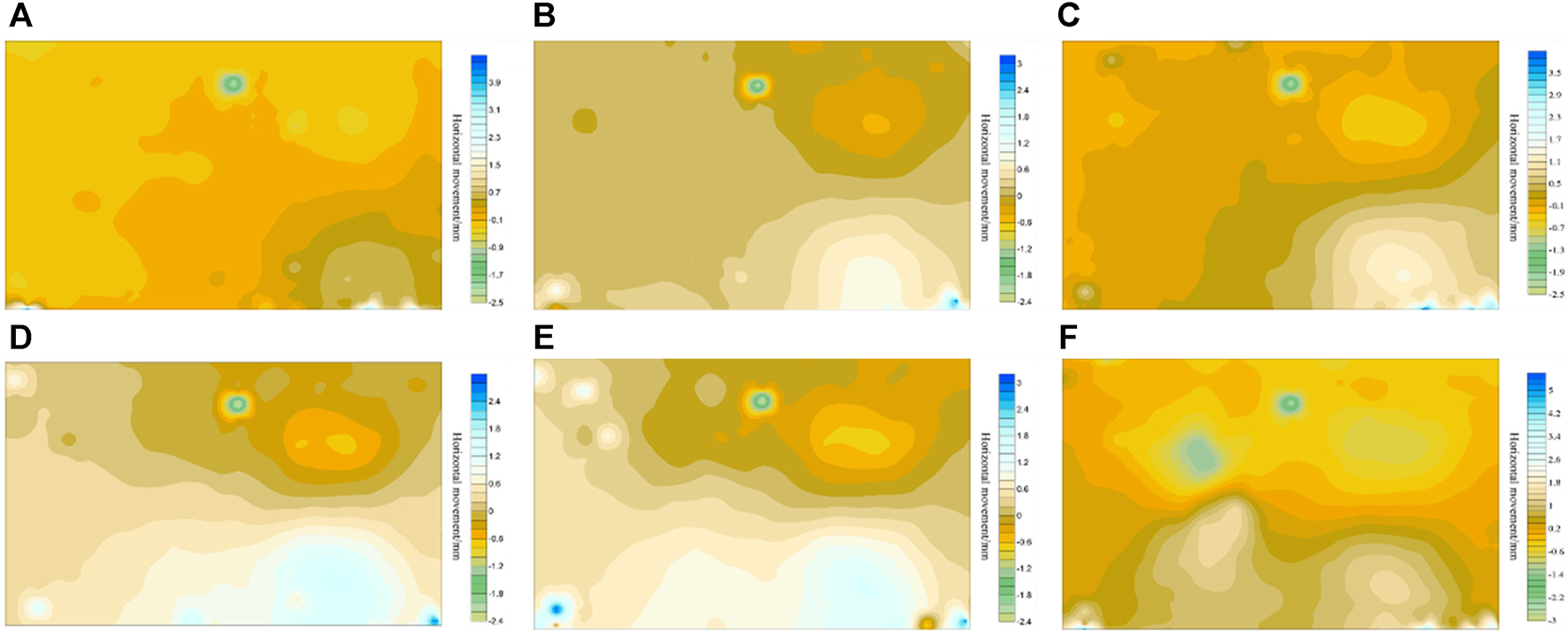 Contour maps of model horizontal displacement of the surface strike, (A) coal mining face I advance 200 m, (B) coal mining face I advance 250 m, (C) coal mining face I advance 350 m, (D) coal mining face II advance 200 m, (E) coal mining face II advance 250 m, (F) coal mining face II advance 350 m.